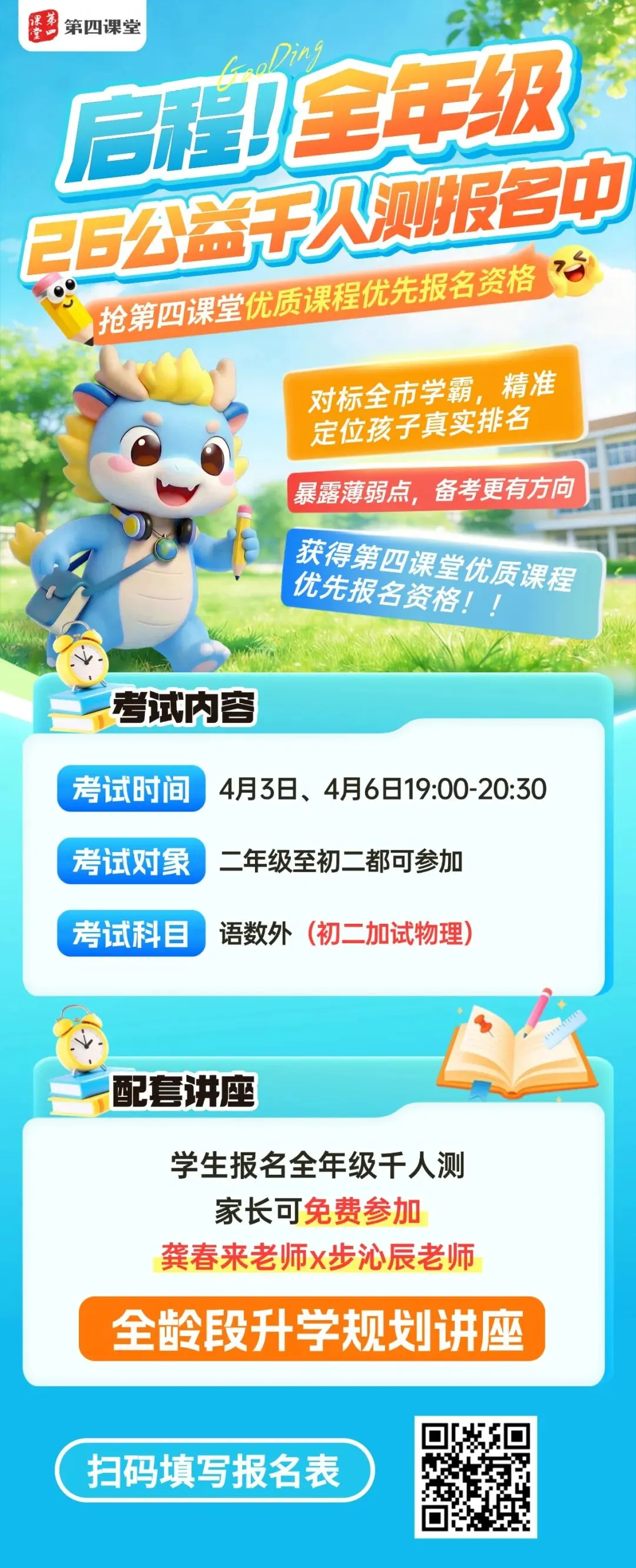 初试为上机考试,初中生考数学、英语、文综(语文、历史)、理综(物理、化学),高中生考语文、数学、英语、物理。