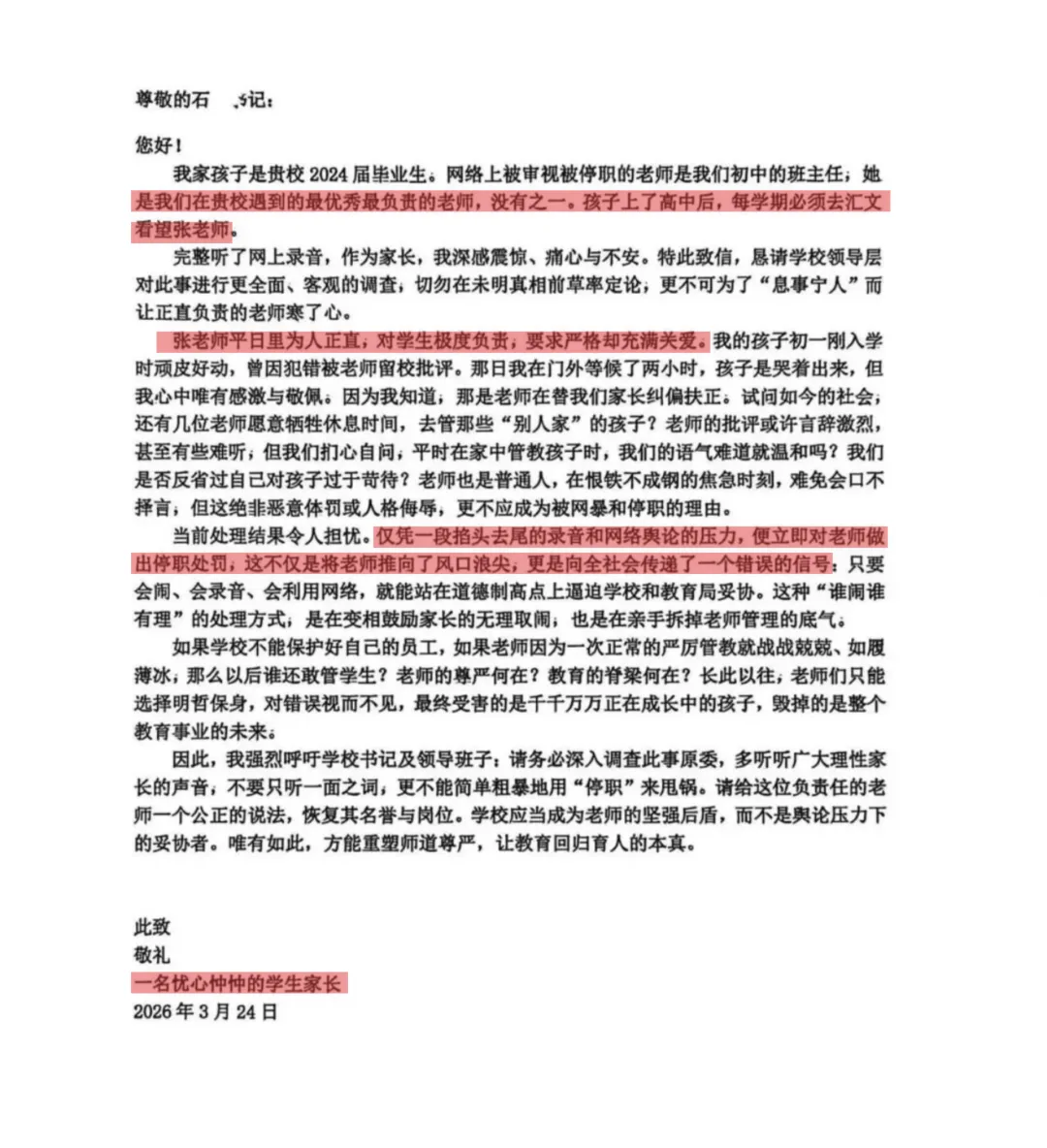 一封据称是张老师
