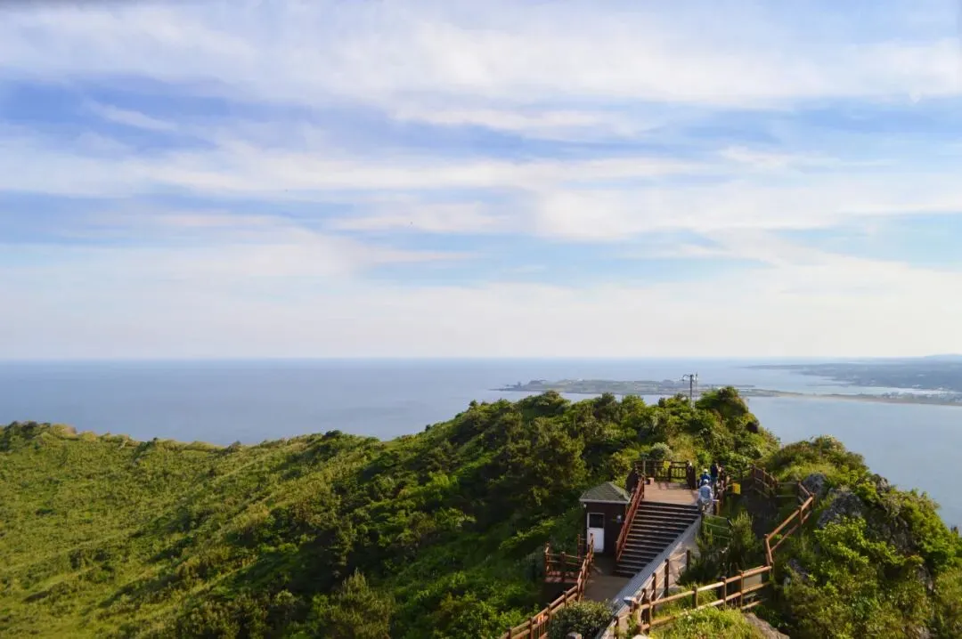 【城山日出峰】(若需登山请自理门票 5000 韩币/人)(约60分钟)2007 年被联合国教科文组织指定为世界自然遗产,位于济州东部海岸线,它是济州岛独特而壮丽的自然景点,以其壮观的日出景观而闻名。无论您是来追求摄影的完美瞬间,还是想亲身感受大自然的壮丽和神秘,这里都是一个不可错过的目的地。