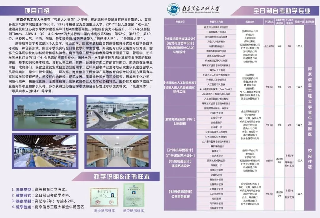 (一)该助学项目由南京信息工程大学主办、南京信息工程大学继续教育学院承办,从根本上保证了办学的真实性和可靠性。自考助学学生与研究生、留学生在园区共同学习、生活、文娱,完全实现了南京信息工程大学优质教学资源全覆盖,在浓郁深厚的学术氛围下享受丰富多彩的校园生活。