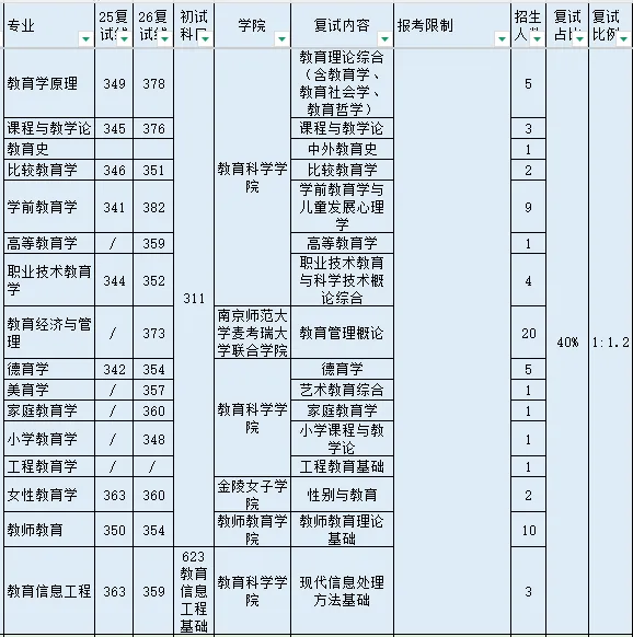 1、招生方向。南京师范大学26年教育学学硕招生专业有:教育学原理、课程与教学论、教育史、比较教育学、学前教育学、高等教育学、职业技术教育学、教育领导与管理、德育学、美育学、家庭教育学、女性教育学、教师教育、小学教育学、教育信息工程。