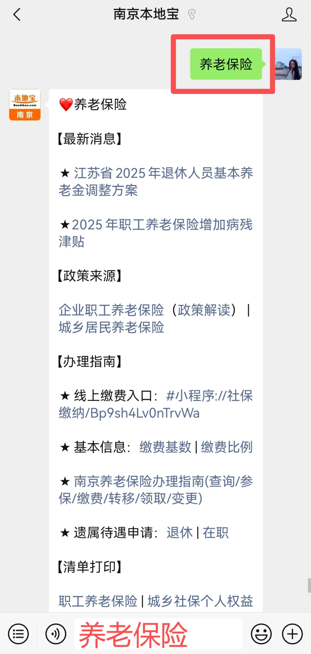☞小编提醒:扫描下方二维码,关注【南京本地宝】,后台对话框回复【养老保险】,即可获取南京2026城乡居民养老保险缴费指南、线上缴费入口、养老待遇查询、常见问题解答;