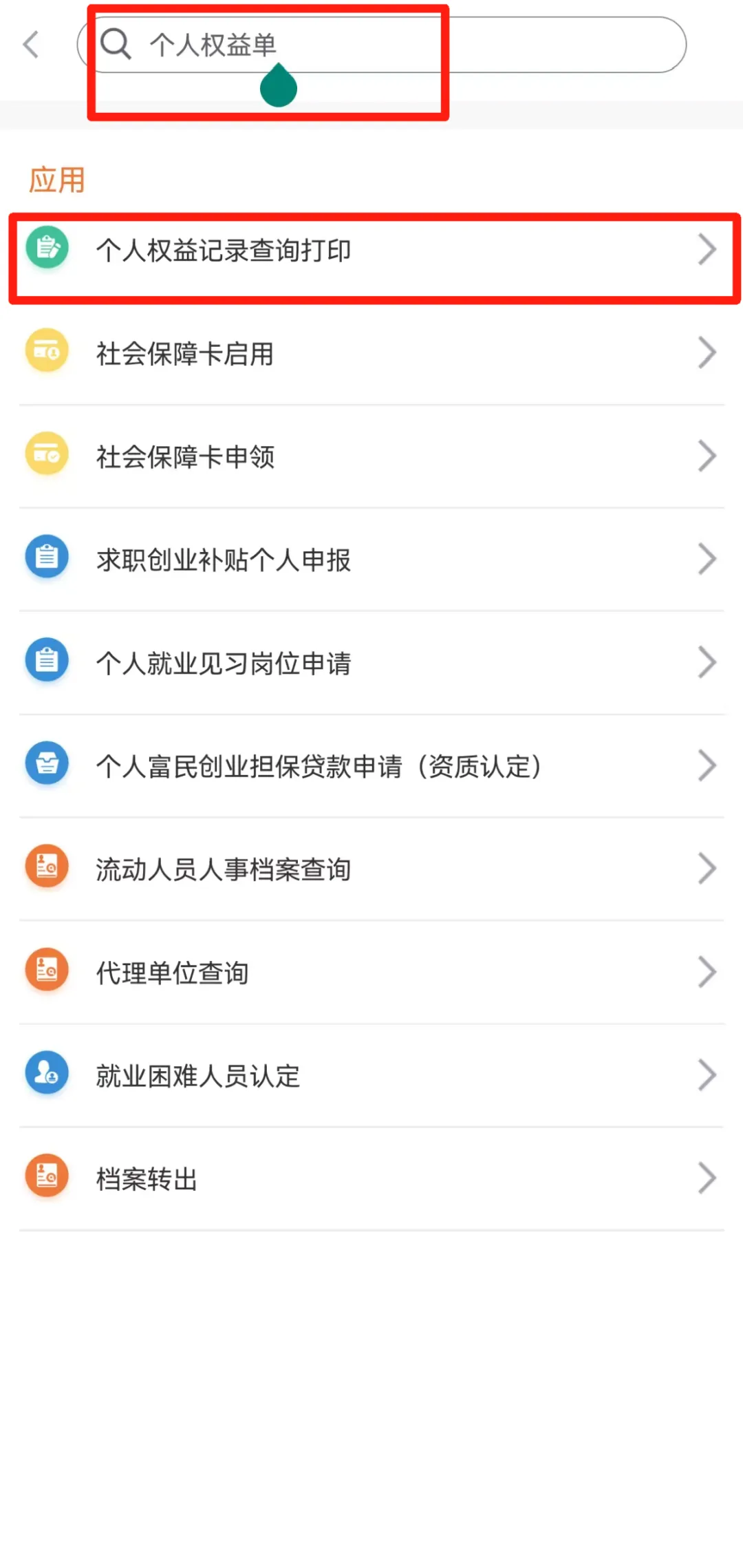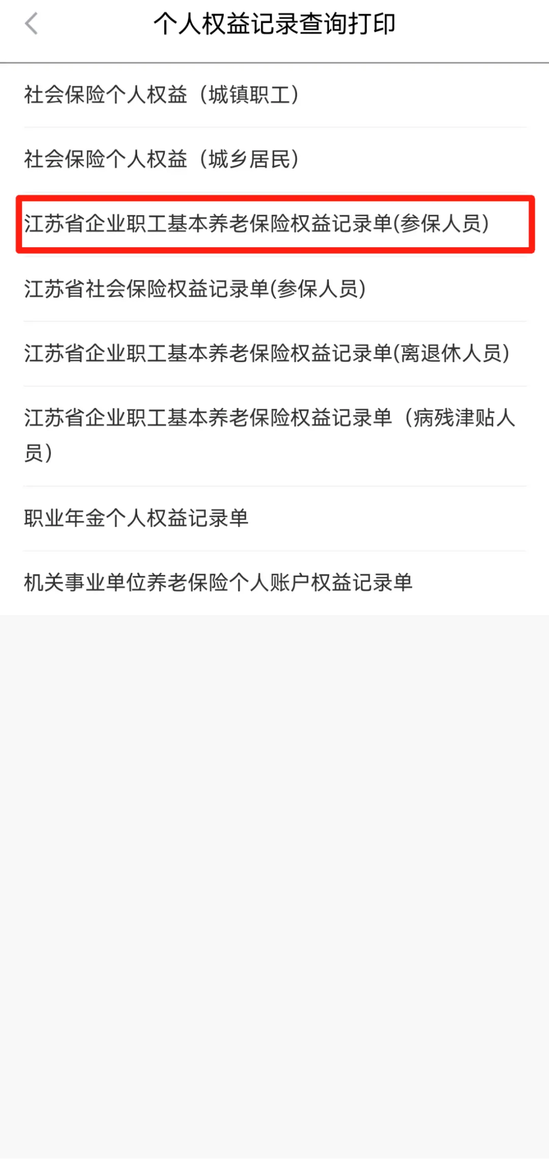 ①在app首页搜索“个人权益单”,点击”个人权益记录查询打印“;点击”江苏省企业职工基本养老保险权益记录单(参保人员)“。