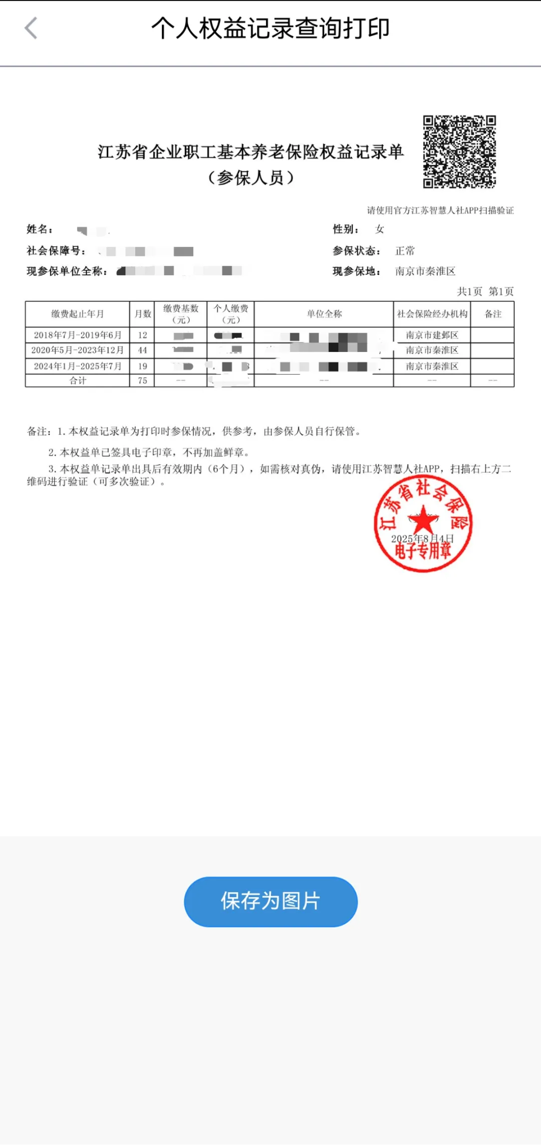 1、通过“江苏智慧人社”APP-“个人权益单”-《江苏省企业职工基本养老保险权益记录单(参保人员)》中查看;