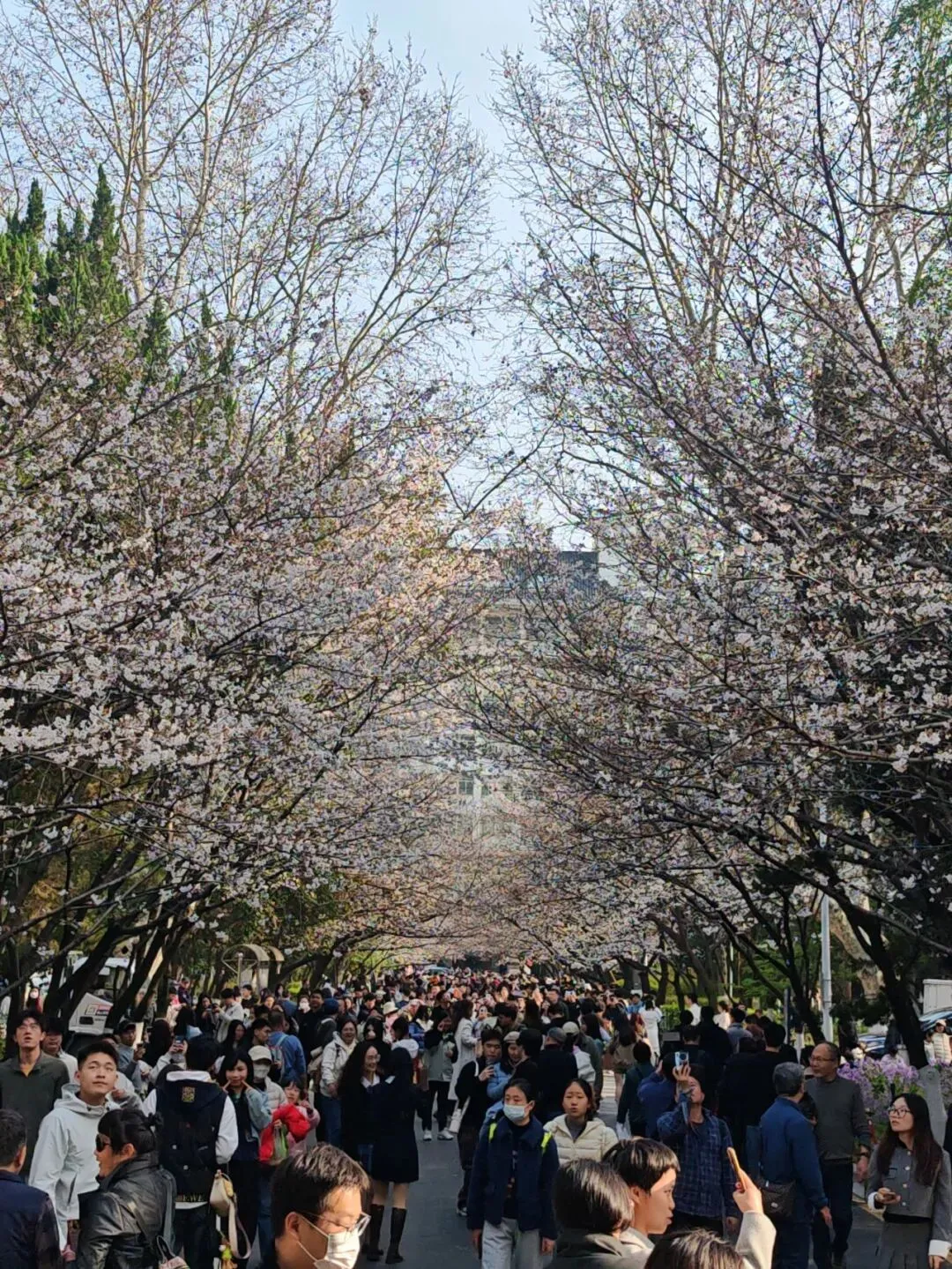 图书馆前的樱花大道全是打卡拍照的人,人比花多,打扮成古装,动漫等各种盛装造型的漂亮小姐姐们有的靠在汽车旁,有的站在高登子上各种姿势的拍照。在短暂的开放中寻找生命永恒的意义。