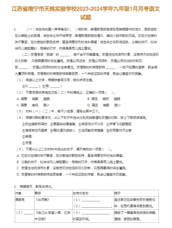 16套2017-2024学年南京各区初三下学期月考语文真题及答案解析