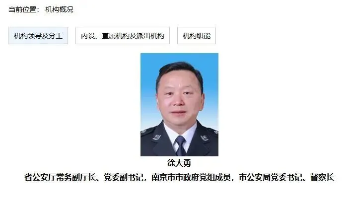 徐大勇,省公安厅常务副厅长、党委副书记,南京市市政府党组成员,市公安局党委书记、督察长。