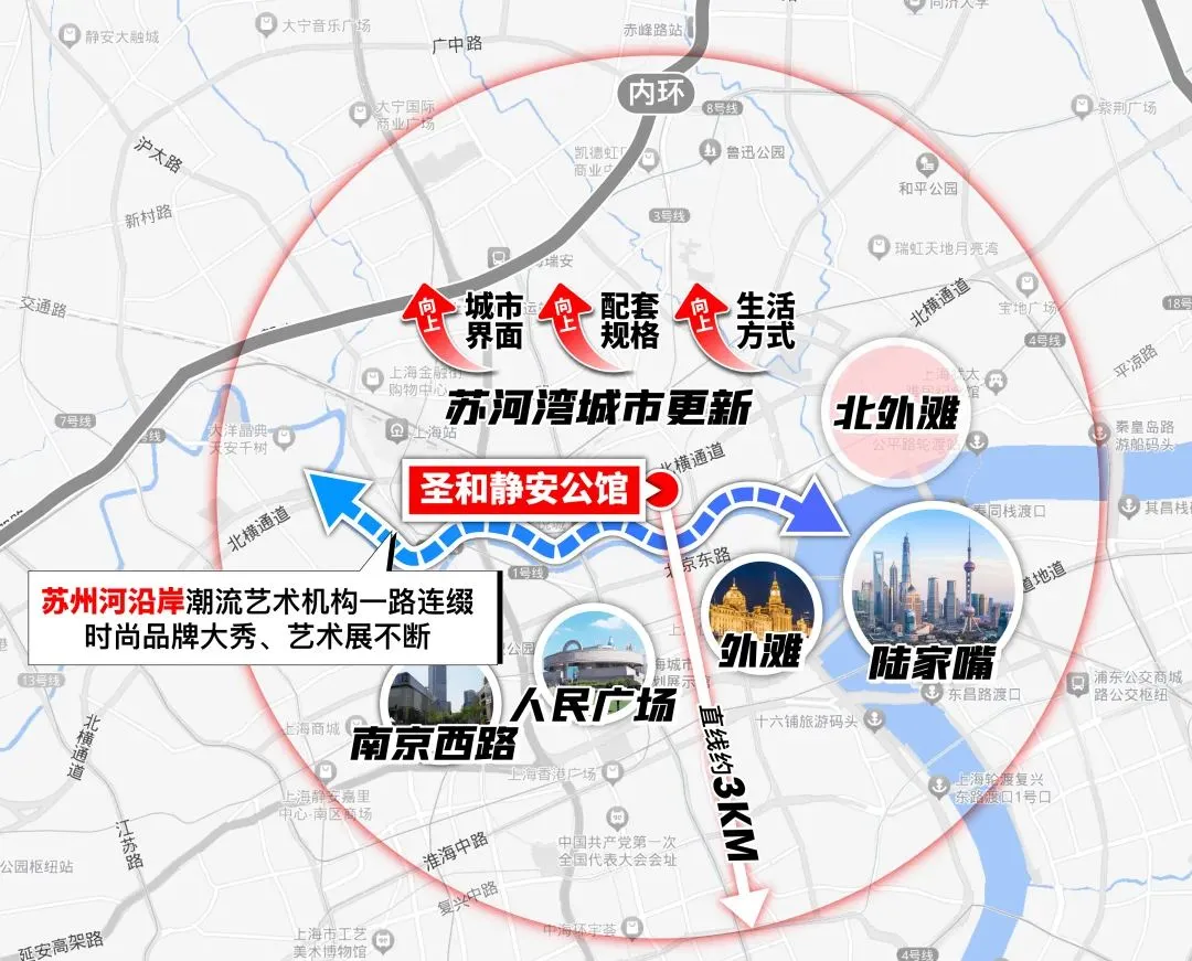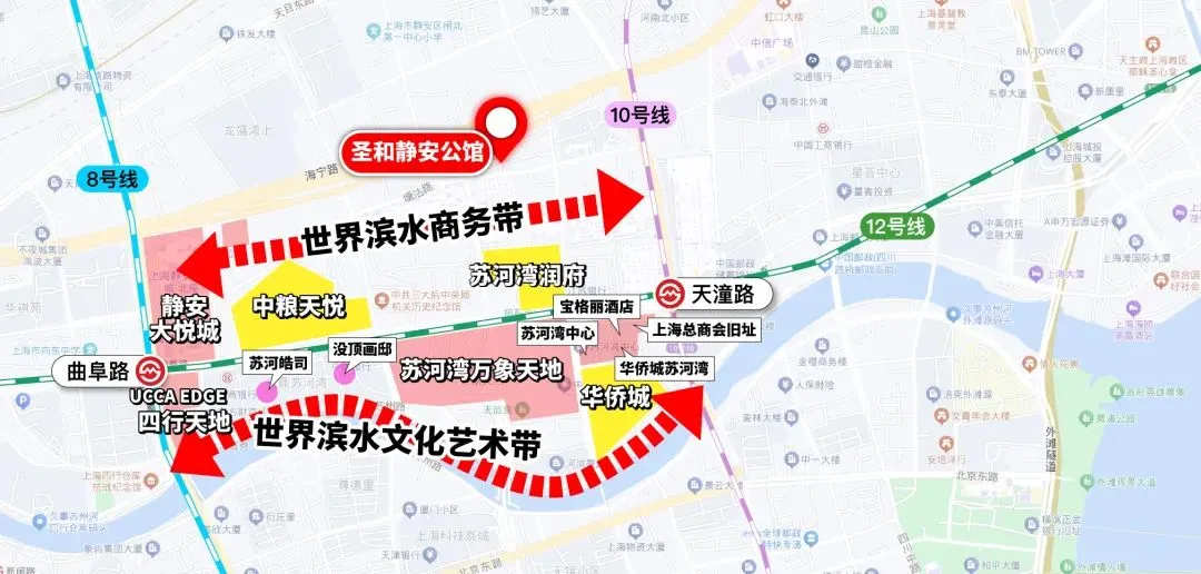 圣和静安公馆傲踞静安苏河湾正核心,坐拥“一河两岸”规划红利,3公里内覆盖大悦城、万象天地等顶级商业综合体,步行约10分钟直达人民广场、南京路、外滩等城市地标,尽享都市繁华。