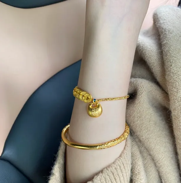 他给我拿了套足金配文玩的组合 一个手镯配个小吊坠 还有几个铜钱造型的珠子串在一起 我当时觉得挺精致 但心里还是嘀咕"这得多少钱啊" 表叔让我先戴着试试 说戴七天再来找他 我那会儿没懂他什么意思 就这么戴回家了