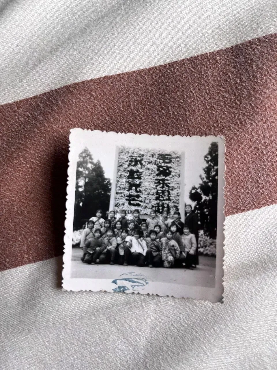 这张照片里,背景的标语牌“毛泽东思想永放光芒”,是那个时代最鲜明的印记。那时候的春游,不只是玩乐,更是一堂生动的爱国主义教育课。