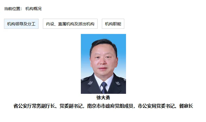 据南京市公安局官网“机构领导及分工”页面更新显示,徐大勇,现任江苏省公安厅常务副厅长、党委副书记,南京市市政府党组成员,市公安局党委书记、督察长。