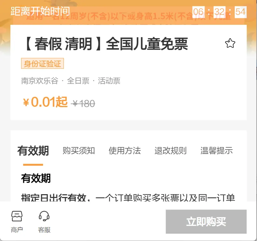 ➡️使用时间:4月1日-4月6日;适用于1名年龄在12周岁(不含)以下或身高在1.5米(不含)以下的儿童,凭儿童本人身份证原件或户口本有效证件原件验证入园。