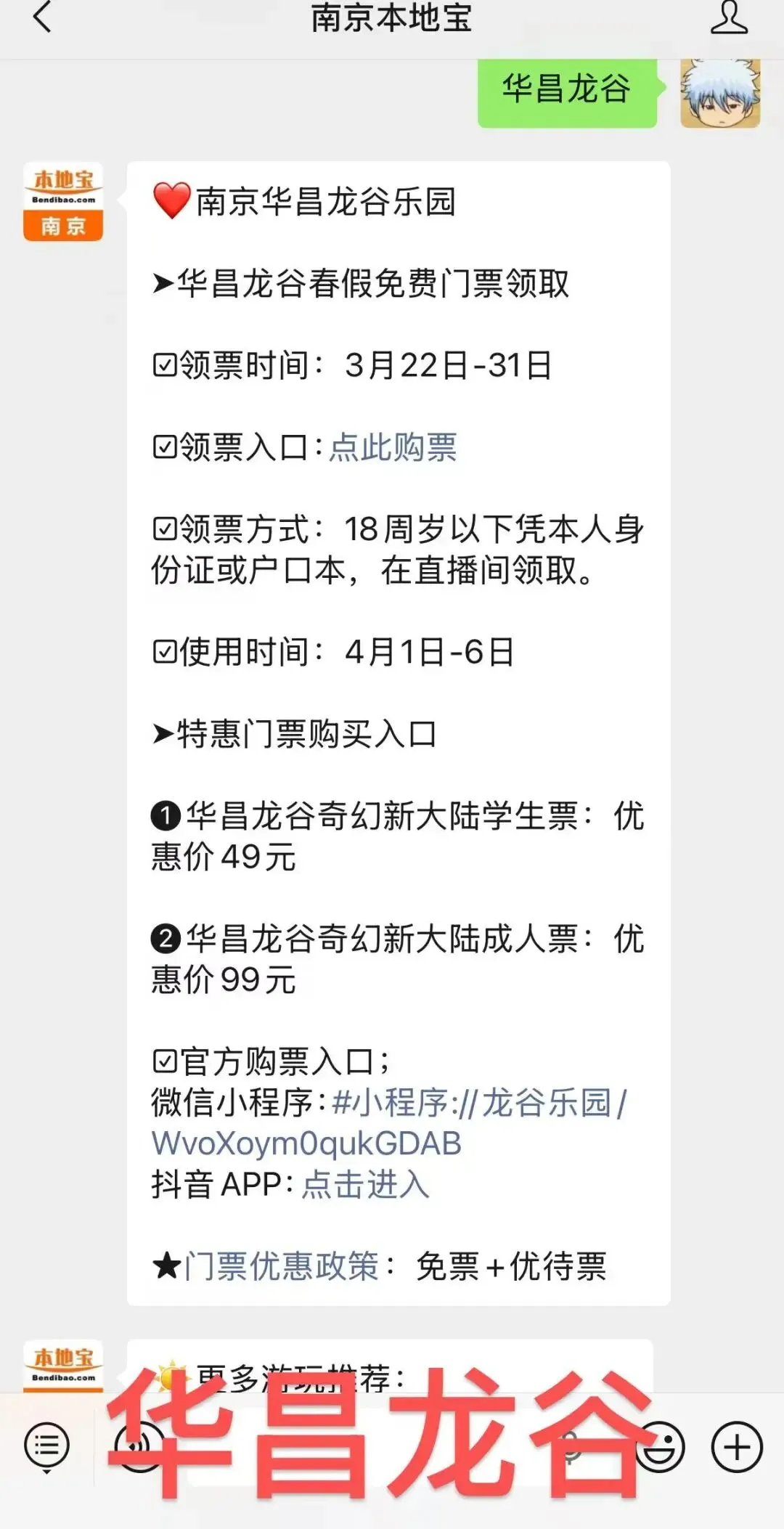 或者扫描下方二维码,关注南京本地宝,后台对话框回复【华昌龙谷】即可获取快捷领取入口、领取指南、游玩攻略等。