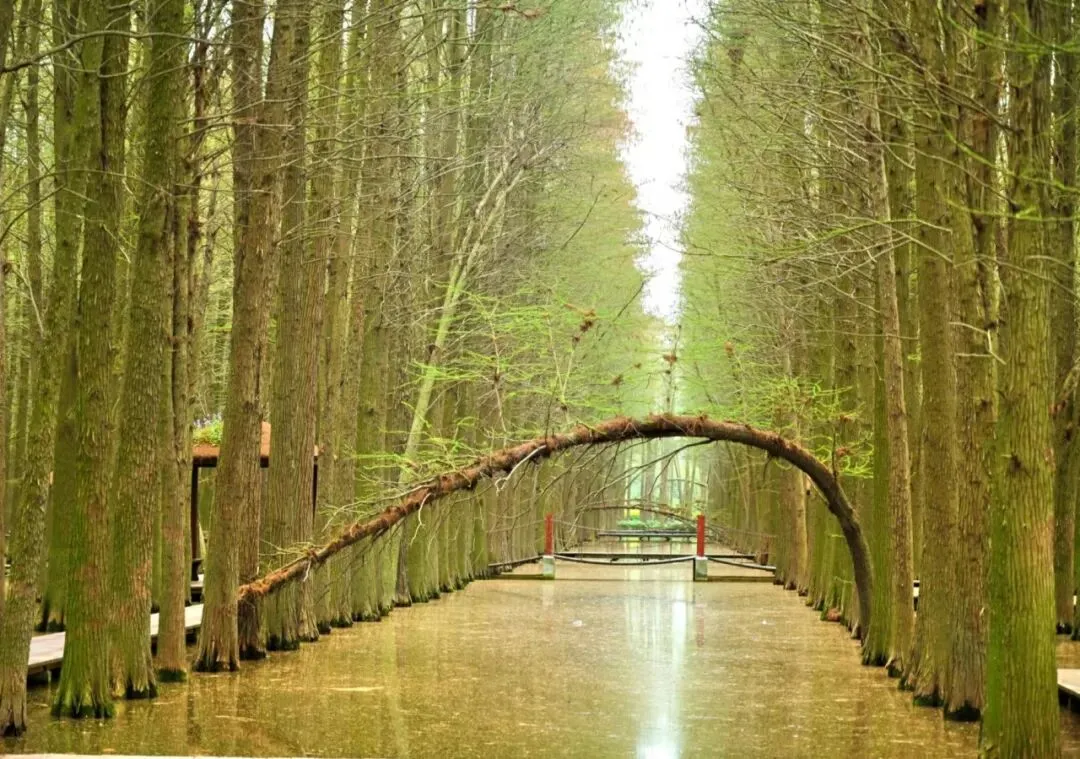 李中水上森林:规模宏大的人工湿地森林生态系统,入林中,或顺水泛舟,或林中漫步,眼中是岸芷汀兰,郁郁青青;参天水杉、池杉倒影水中,鸟在林中欢唱,时有鱼儿欢快跃出水面。