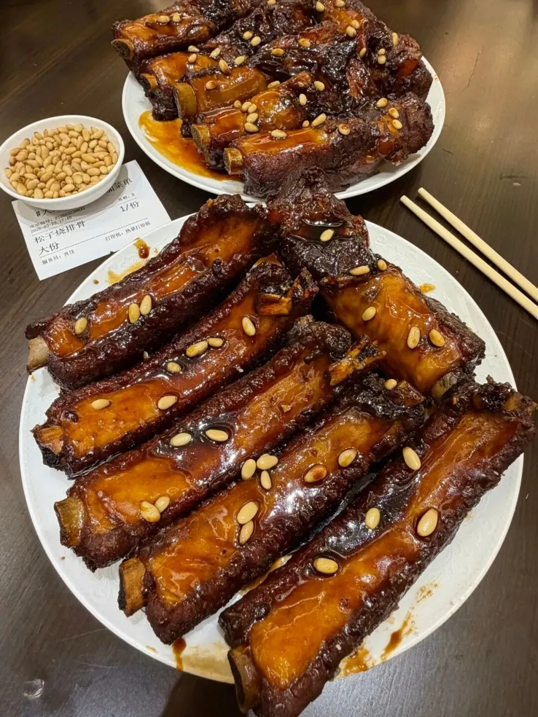 松子红烧排骨,大脆骨带着嚼劲,肉质酥烂不柴,甜度恰好,松子温润回甘,越嚼越香。