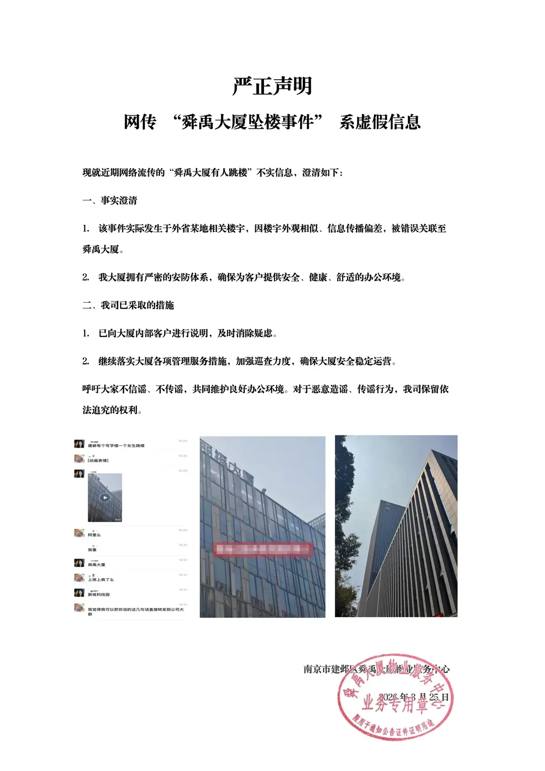 近期,网络流传南京“舜禹大厦有人跳楼”。3月25日,舜禹大厦物业服务中心发布声明称,该消息为不实信息,事件实际发生于外省某地相关楼宇,因楼宇外观相似、信息传播偏差,被错误关联至舜禹大厦。舜禹大厦物业服务中心表示,已向大厦内部客户进行说明,及时消除疑虑。同时,继续落实大厦各项管理服务措施,加强巡查力度,确保大厦安全稳定运营。