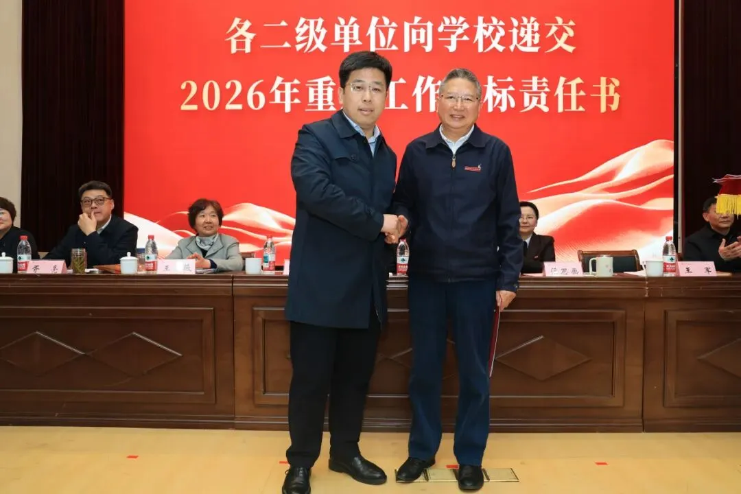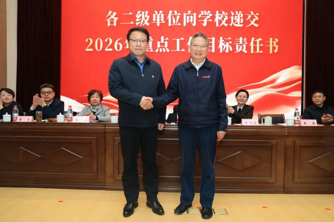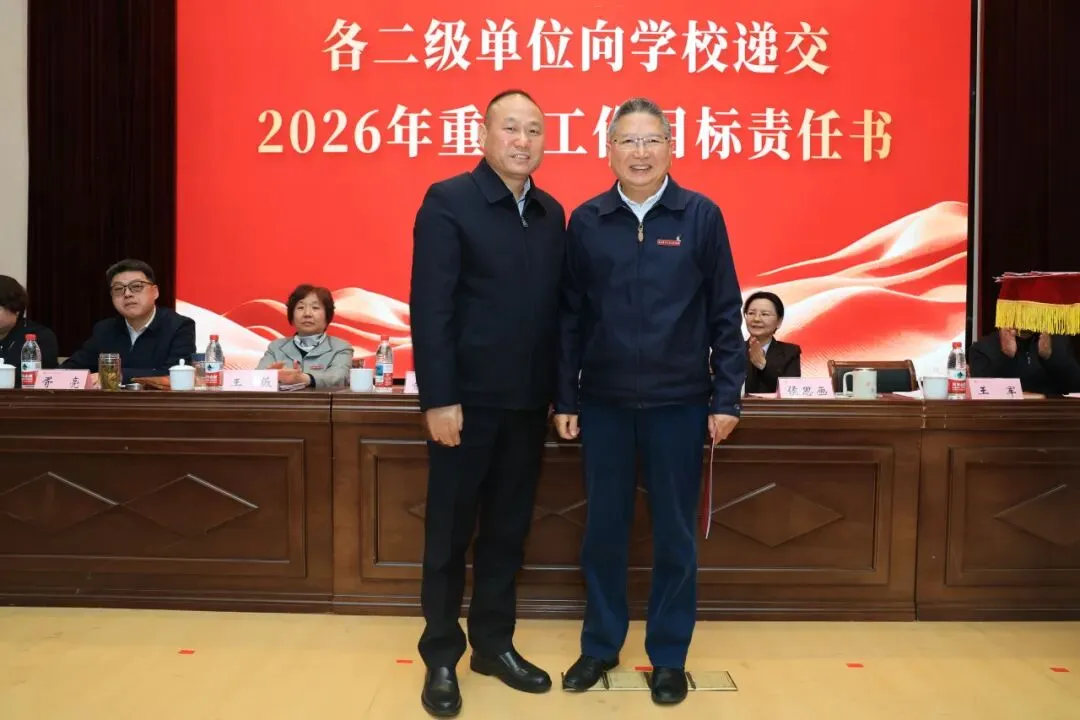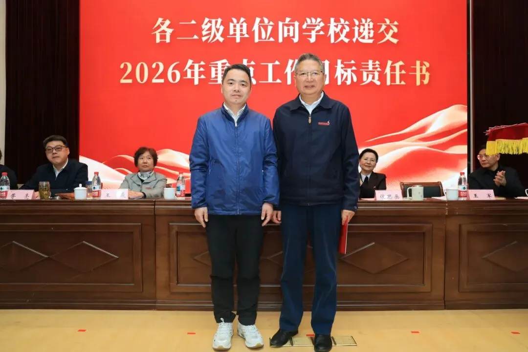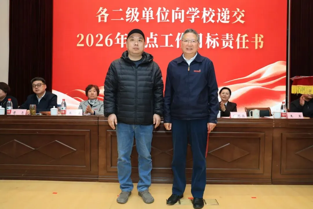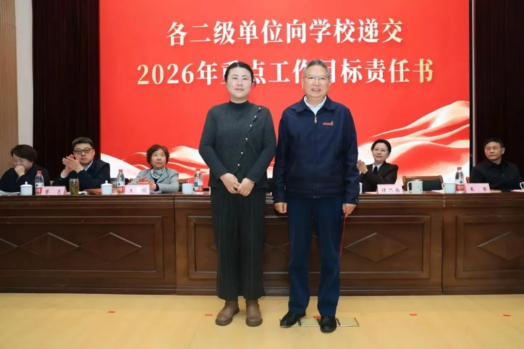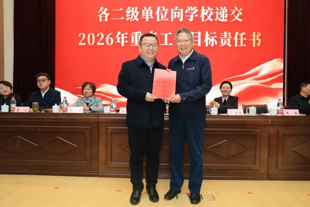 理事会与学校签订2026年重点工作目标责任书,各二级单位依次向学校递交责任书,落实责任,确保年度目标任务落地见效。