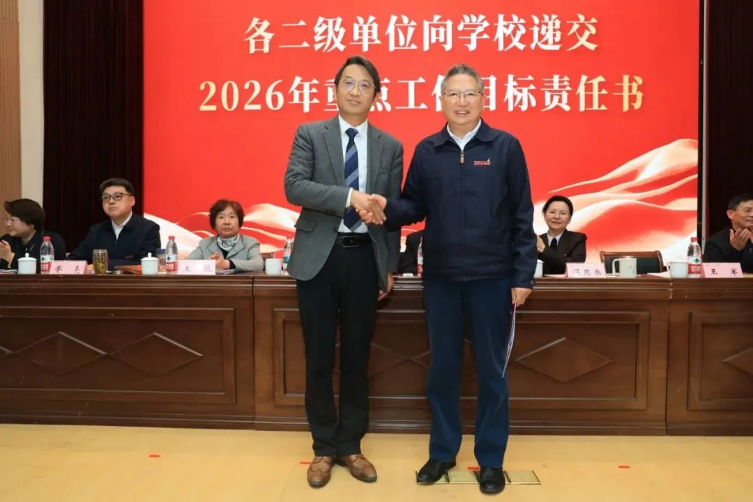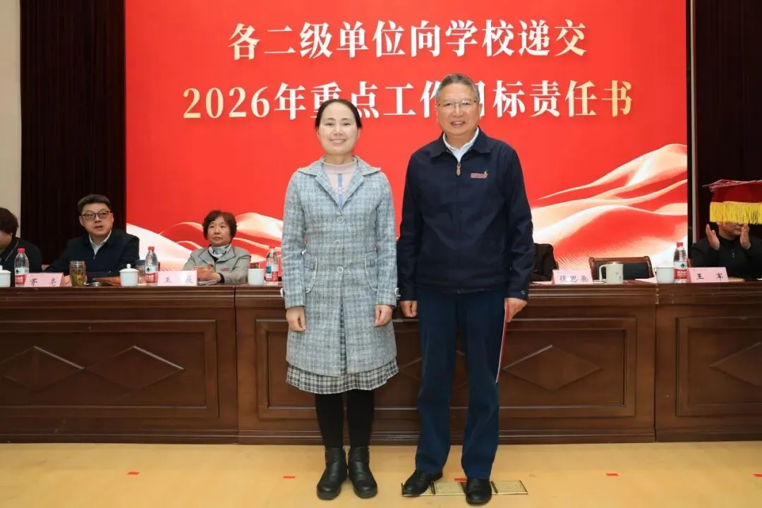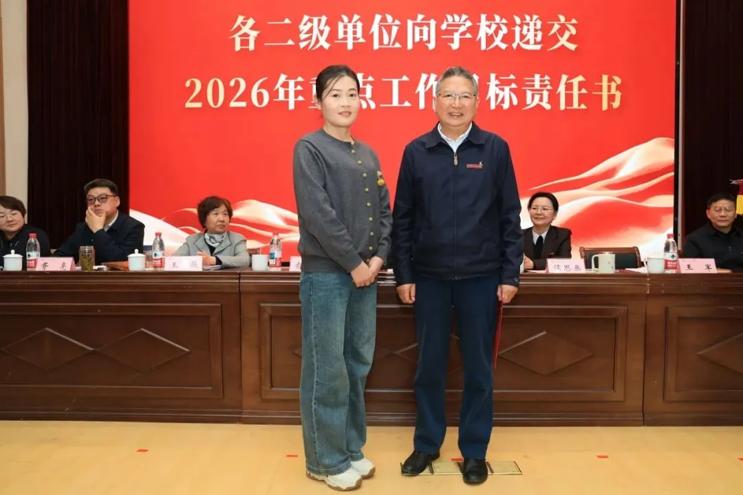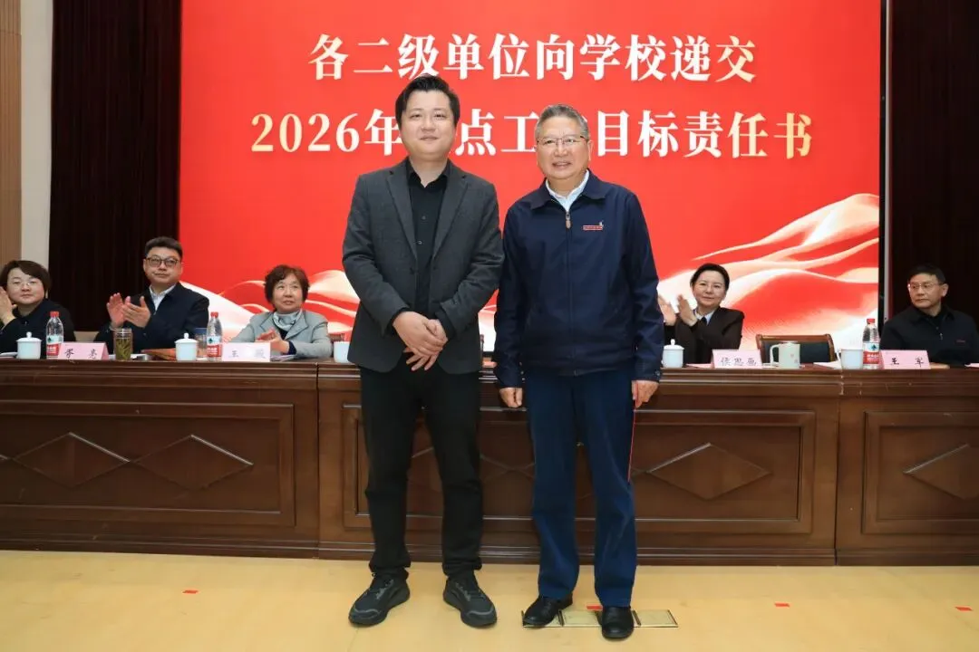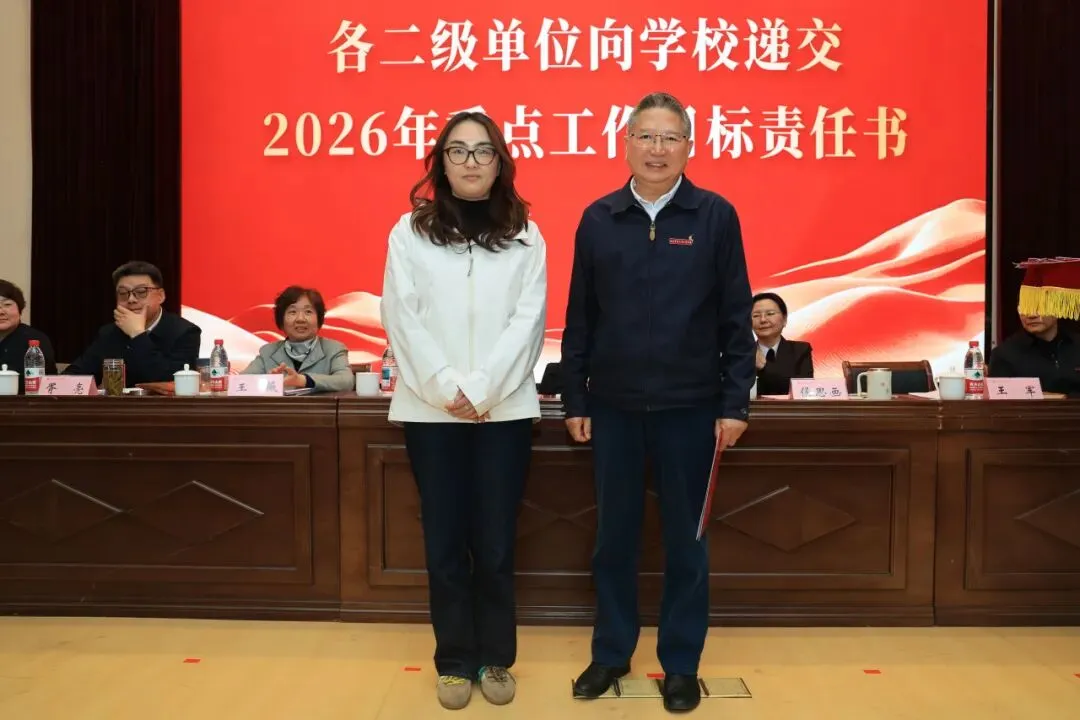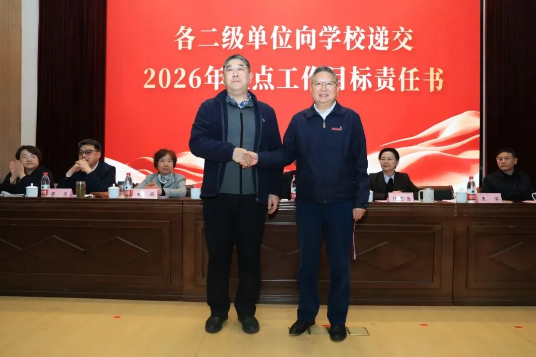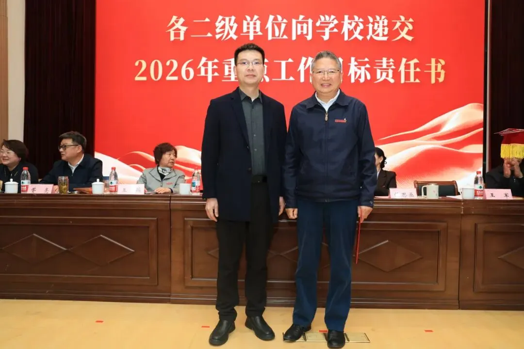 理事会与学校签订2026年重点工作目标责任书,各二级单位依次向学校递交责任书,落实责任,确保年度目标任务落地见效。