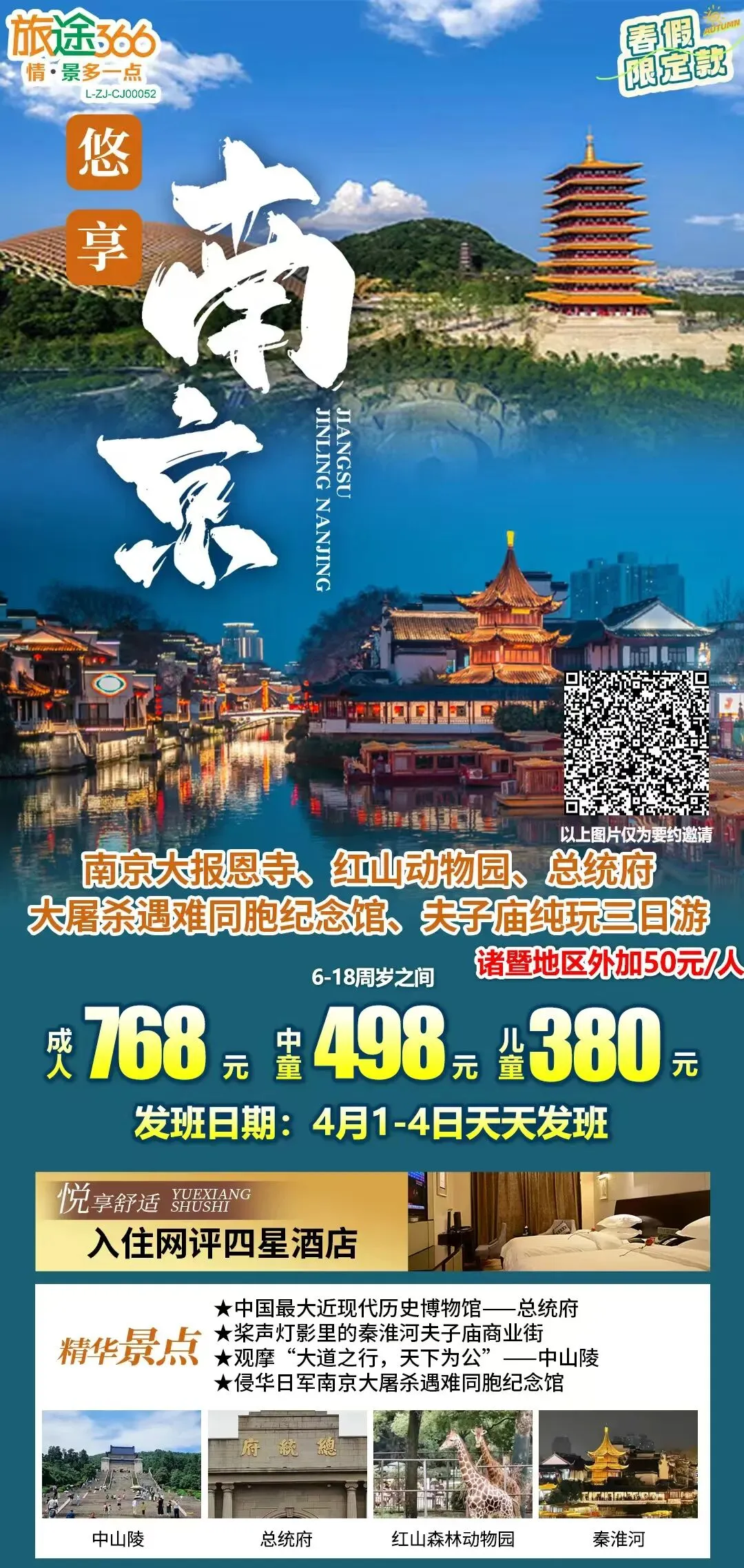 4月1日已成团,有余位【春假·悠享南京】南京大报恩寺、红山动物园、大屠杀遇难同胞纪念馆、总统府、夫子庙亲子纯玩三日游(入住四钻酒店