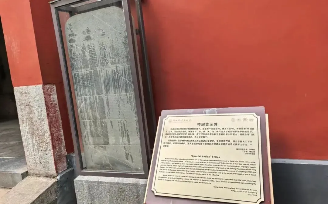 碑殿外,也有一方用日,德,意,英,法,侯六国文字的"特别告示"砖。