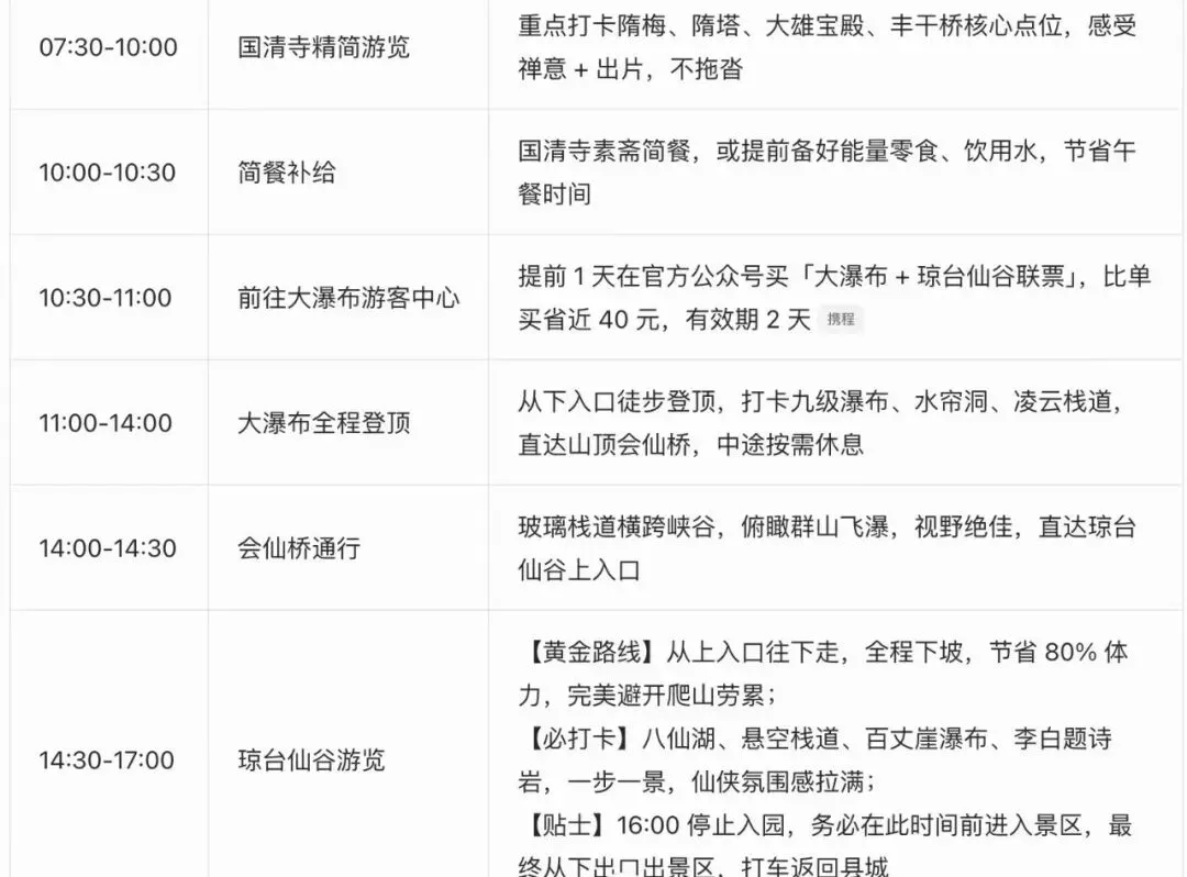 建议游玩顺序1:大瀑布(上) -> 会仙桥(过)-> 琼台仙谷(下)->大瀑布(大巴回)。