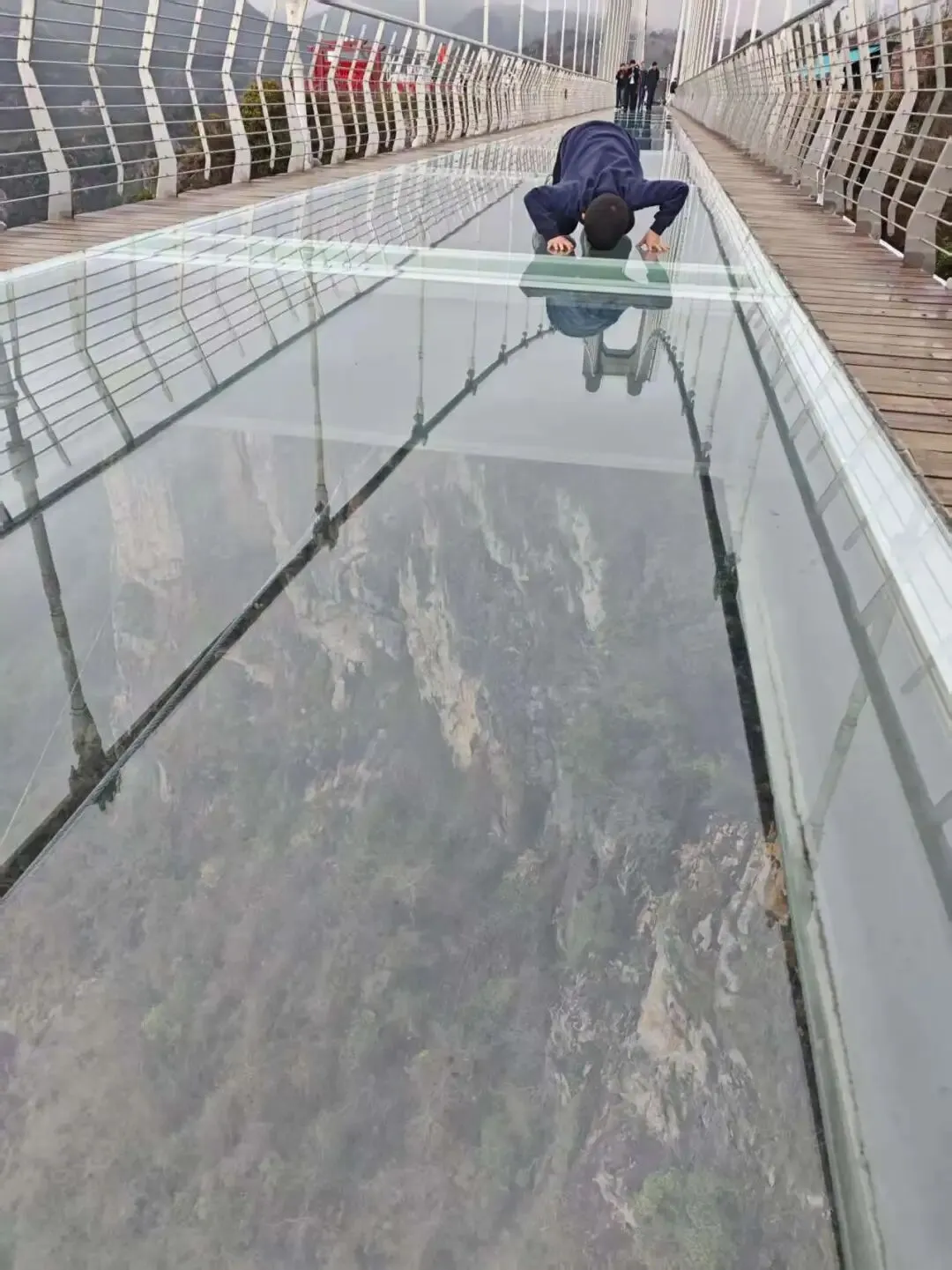透过透明的玻璃,我向下看了一眼,那是千丈悬崖,吓得腿都抖得不得了,儿子却趴在上面狠狠地向下看。