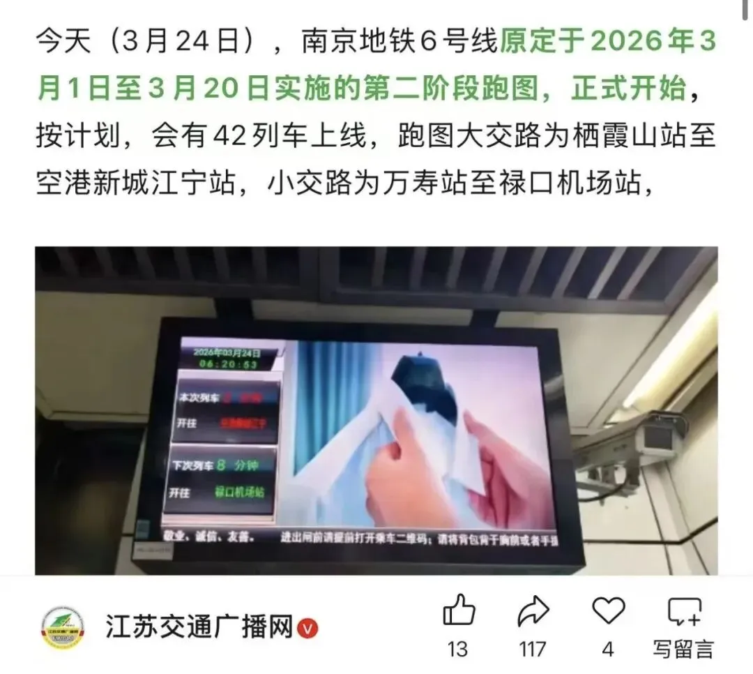 3月24日,南京地铁6号线正式启动与S1、S7号线的贯通跑图,这是通车前的关键节点。全线计划4月下旬完成跑图,后续将推进联调联试与安全评估,上半年开通的节奏已非常清晰。