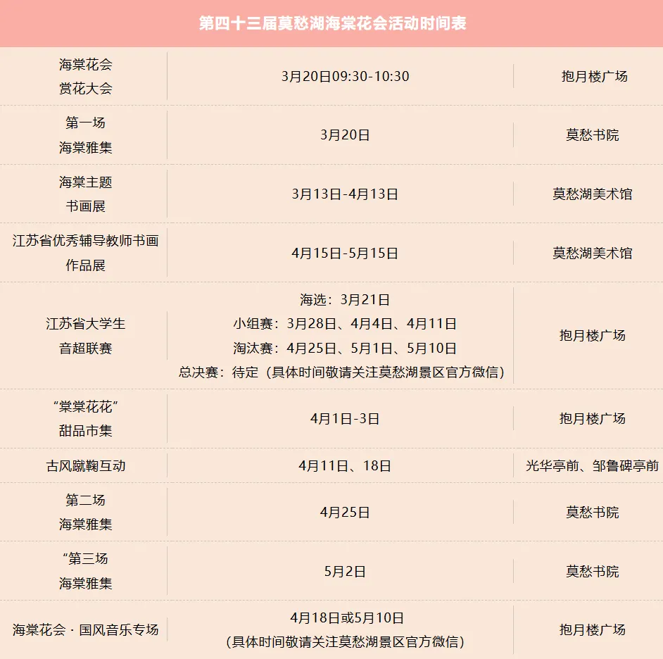 莫愁湖的海棠花会目前已举办43届,花会时间自3月20日开始,一直持续到5月10日。
