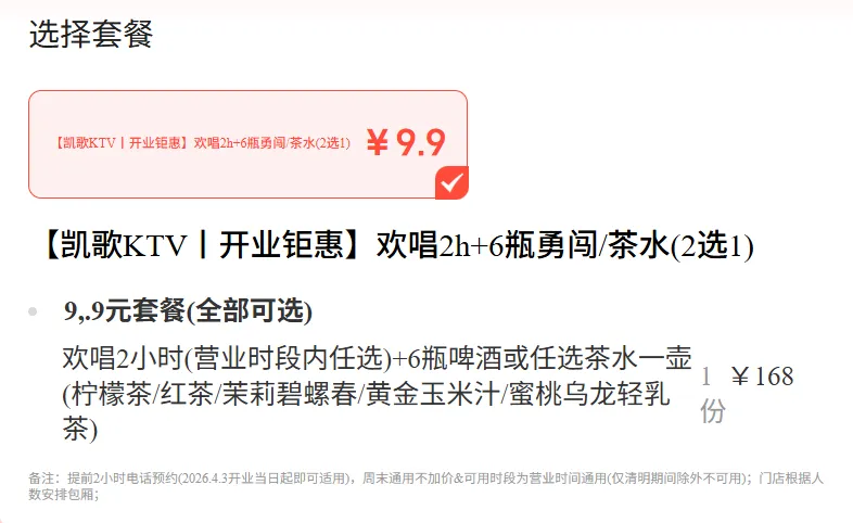凯歌KTV(南京曼度店)江苏省南京市玄武区杨将军巷9号D9街区曼度广场4楼购买日期· 2026.03.23 - 2026.04.17使用时间· 2026.04.03 - 2026.04.29预约方式· 至少提前2小时致电商家预约,高峰期需等位营业时间· 周一至周日2026.04.03-04.29(2026年4月3日开业当日起即可适用)酒吧类使用规则· 套餐内包含的酒水不可打包带走,仅限店内存放使用规则· 周末节假日适用(2026.2.28开业当日起即可适用)· 本套餐不可叠加使用· 图片仅供参考· 活动不可同时享受店里其他优惠活动,大于套餐内容费用,按店内实际收费另付· 购买此套票视为认同此声明及认同活动规则用户退款说明· 放心囤,随心退订单在使用有效期内,未使用,未预约,未核销均可直接发起全额退款。如有特殊使用规则,以商家使用说明为准。购买日期· 2026.03.23 - 2026.04.17使用时间· 2026.04.03 - 2026.04.29预约方式· 至少提前2小时致电商家预约,高峰期需等位营业时间· 周一至周日2026.04.03-04.29(2026年4月3日开业当日起即可适用)酒吧类使用规则· 套餐内包含的酒水不可打包带走,仅限店内存放使用规则· 周末节假日适用(2026.2.28开业当日起即可适用)· 本套餐不可叠加使用· 图片仅供参考· 活动不可同时享受店里其他优惠活动,大于套餐内容费用,按店内实际收费另付· 购买此套票视为认同此声明及认同活动规则用户退款说明· 放心囤,随心退订单在使用有效期内,未使用,未预约,未核销均可直接发起全额退款。如有特殊使用规则,以商家使用说明为准。如果你喜欢唱K、开Party,接下来你可能会心跳加速