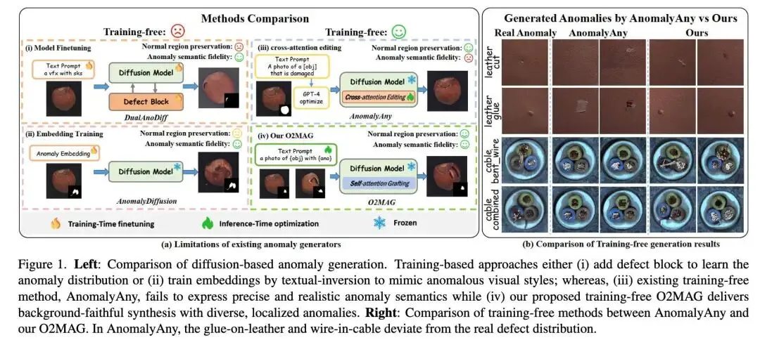但传统生成异常图像的方法有两个大痛点:一是大多需要针对具体数据集做大量的微调训练,耗时又耗算力,换个场景就得重新来;二是生成的异常图像要么失真严重,要么和真实场景的异常特征不符,用这些样本训练的模型,实际检测效果大打折扣。大家一直盼着能有一个免训练、高保真的异常图像生成方法,解决样本制作的难题。