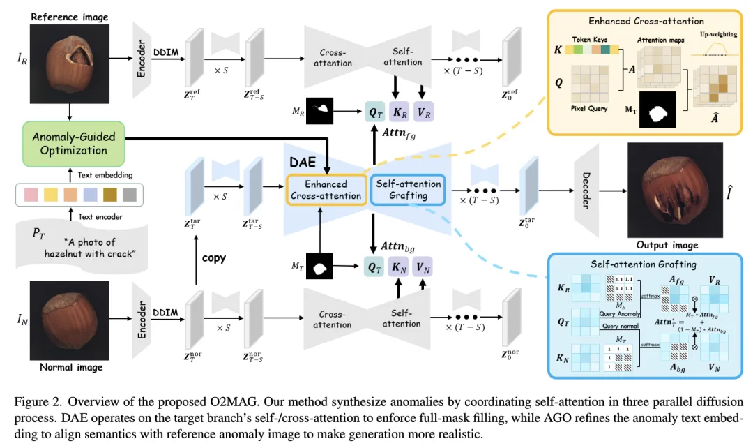 这篇论文提出的O2MAG(One-shot High-fidelity Abnormal Image Generation) 核心就是“单步、免训练、高保真”,针对传统方法的痛点做了精准创新: