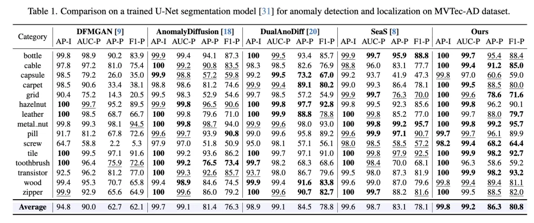 - 生成效果层面:在图像保真度、异常特征合理性的客观指标上,O2MAG大幅领先现有方法,人工评估也显示,其生成的异常图像和真实异常图像的相似度极高,几乎难以区分。