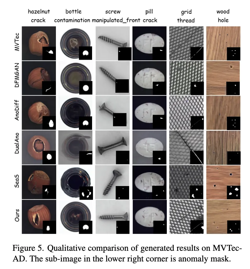 - 下游检测层面:用O2MAG生成的异常图像作为样本,训练/优化后的异常检测模型,在检测精度、召回率等核心指标上均有显著提升,在部分工业质检、自然场景的数据集上,检测效果的提升幅度尤为明显。 同时实验还验证了O2MAG的泛化能力——在不同类型、不同场景的数据集上,都能稳定生成高质量异常图像,不会出现“换数据集就拉胯”的情况。