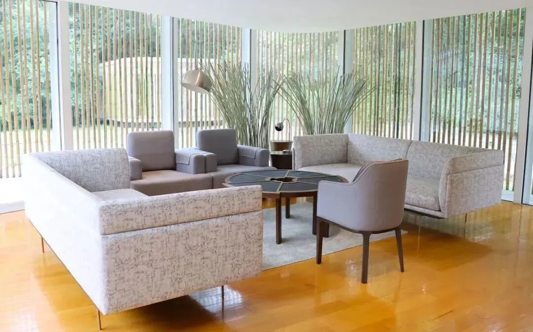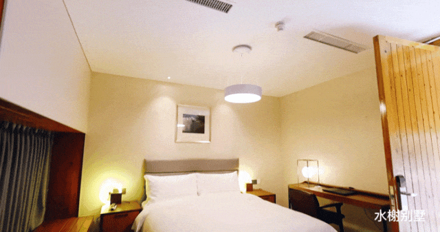 佛手别墅面积290㎡,4张1.8米大床。佛手借用了佛手湖的名字。外部是蜿蜒的竹子屏风,内部是半透明的玻璃,整体建筑运用了许多曲面,无论是在外走动还是在廊间穿梭,都能感受到虚实结合和光线变化所带来的的律动感。