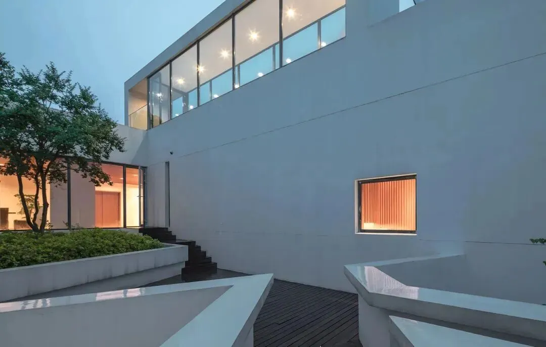 碉堡别墅面积401㎡,配3张1.8米大床。张雷当时在设计的时候,不想破坏原本的自然地貌,就没有动土方,所以有了外观白色,直立呈现的碉堡。从外面看,窗户非常窄,是像中国的卷轴般狭窄细长的视野,颇具诗意。