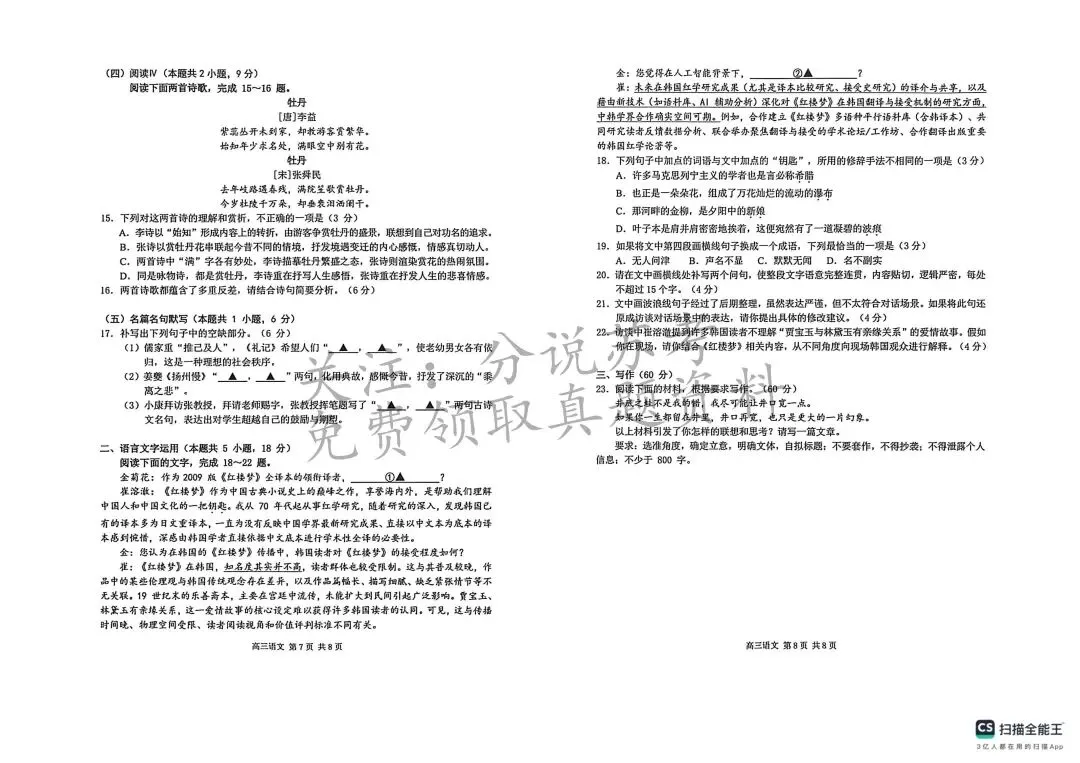 2026届高三南京盐城一模今日开考,最新语文试卷流出,各科真题稍后陆续更新。