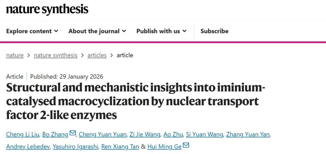 2026年1月29日,南京大学生命科学学院戈惠明教授和张博教授团队在天然药物大环合成研究方面取得进展,相关成果以“核转运因子 2家族酶介导的亚胺催化大环化反应的结构基础与机制解析(Structural and mechanistic insights into iminium-catalysed macrocyclization by nuclear transport factor 2-like enzymes)”为题,在《自然·合成》(Nature Synthesis)杂志在线发表。该项目获得国家自然科学基金项目(批准号:82525108、22193071、22437003)等资助下完成,论文链接:https://doi.org/10.1038/s44160-025-00989-z。