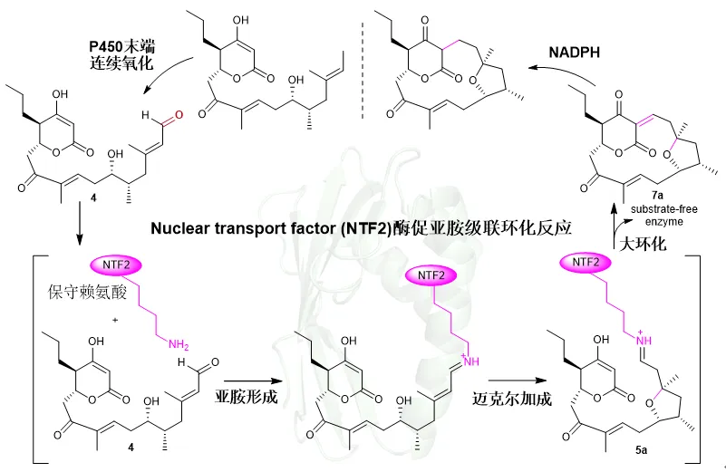 研究团队以akaeolide与mangromicin等具有药物开发潜力的全碳大环聚酮为模型,综合运用异源表达、基因编辑、中间体追踪、酶促合成、X射线晶体学与定点突变等药学与合成生物学研究手段,首次完整阐明了该类分子的生物合成途径。研究发现,一类核转运因子2(NTF2)样蛋白可作为高效的生物催化剂,立体选择性地驱动串联迈克尔加成与脑文格缩合,从而构建出结构独特、富含四氢呋喃环的全碳大环骨架——该类骨架在天然药物分子中往往与显著生物活性相关。
