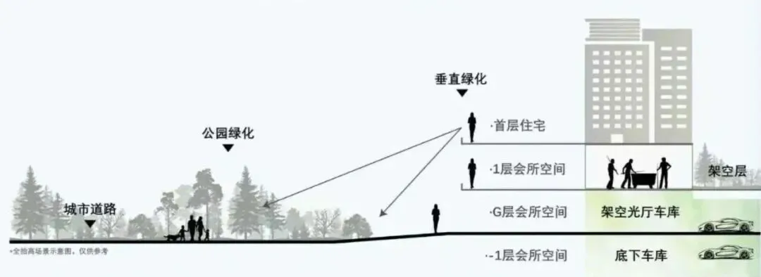 将车库从地下上升到地面之上,抬升约3.6米,全域架空约5米,实现通风采光车库,大幅提升客户感受及居住体验。