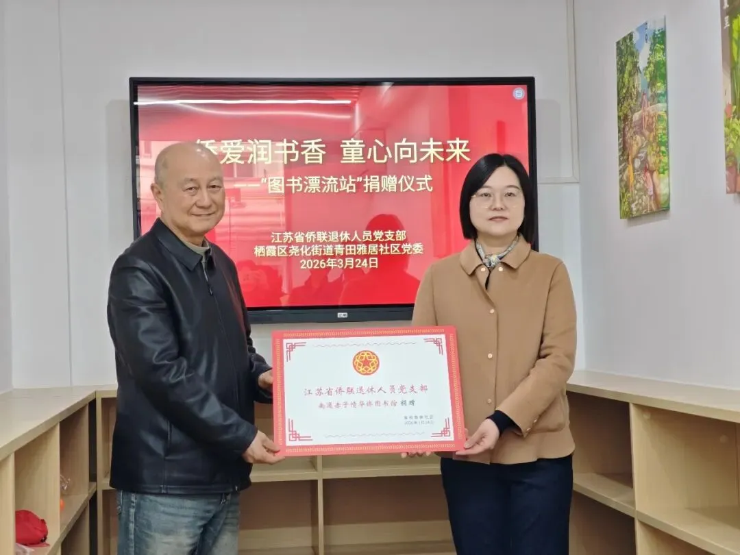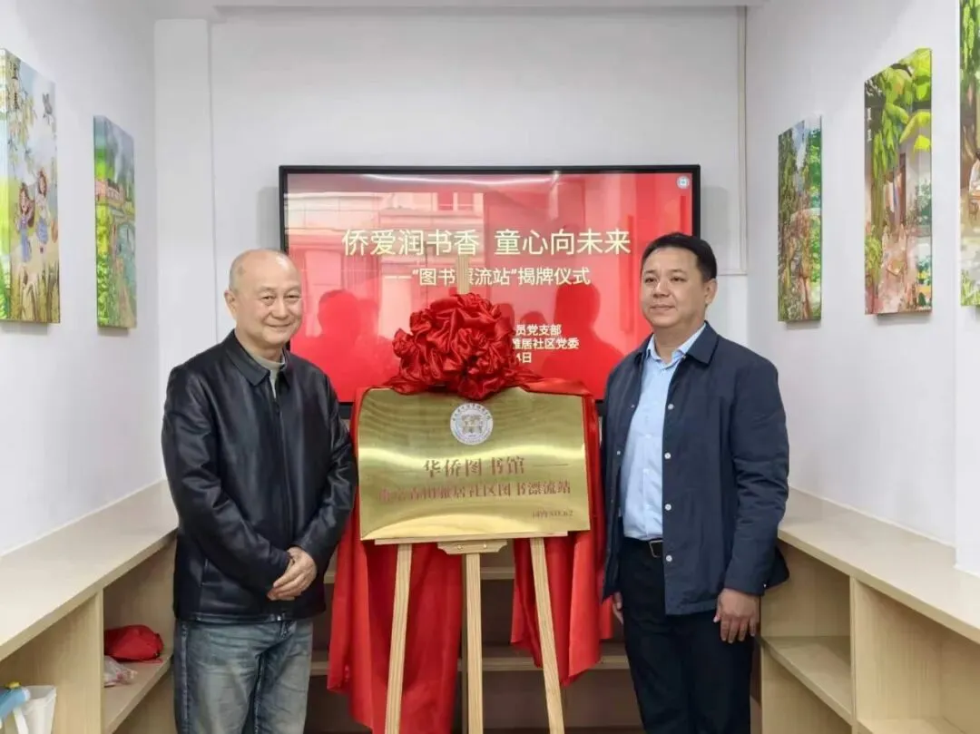 3月24日,华侨图书馆南京青田雅居社区图书漂流站正式揭牌。省侨联原副主席、华侨图书馆发起人镇翔与南京栖霞区尧化街道统战委员伍庄共同为漂流站揭牌。