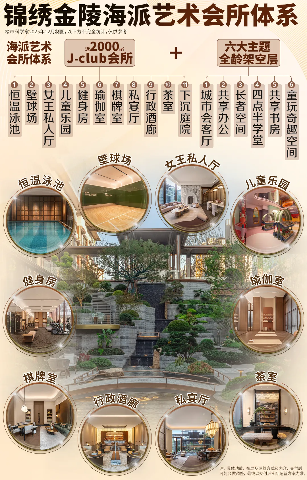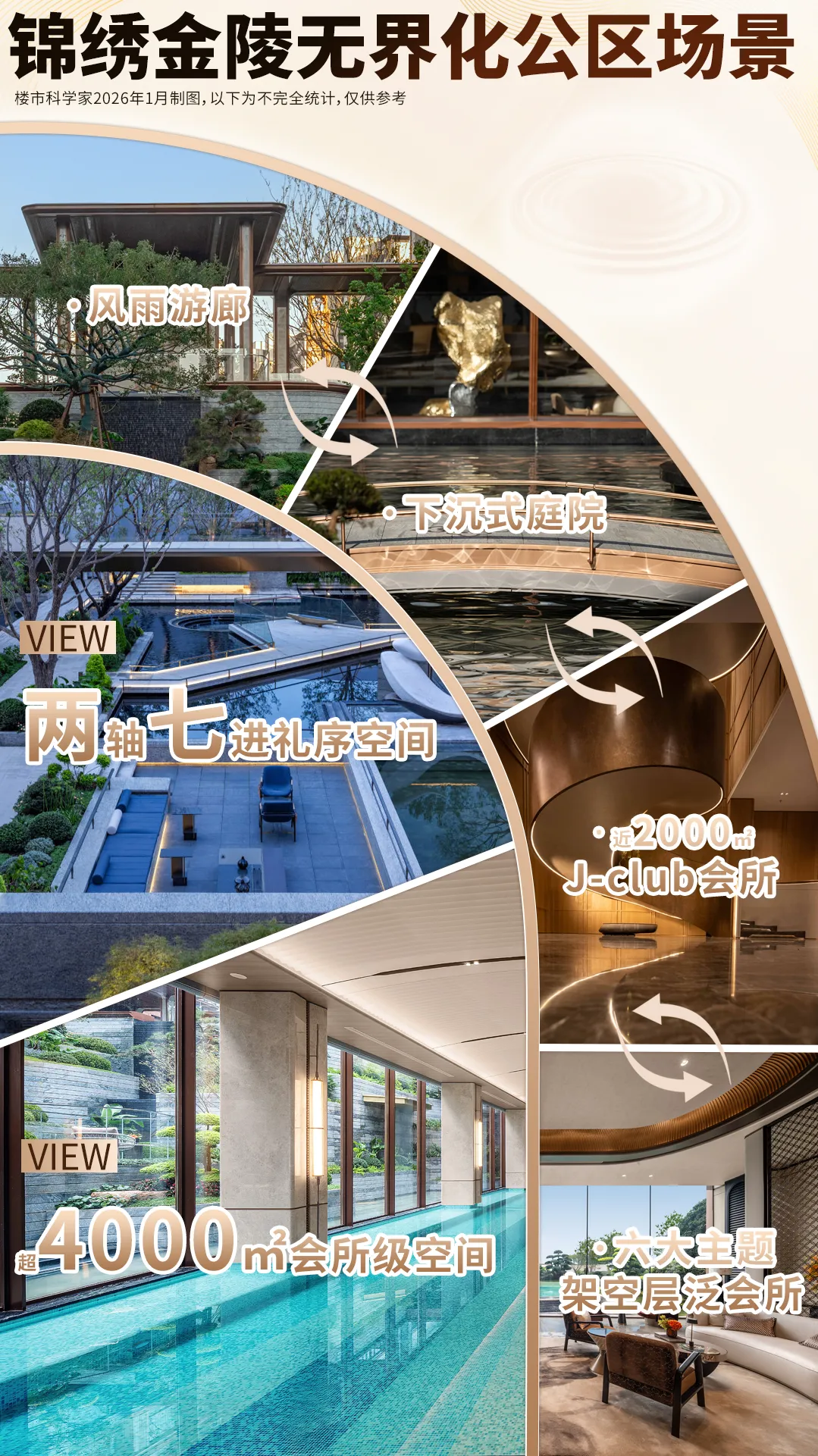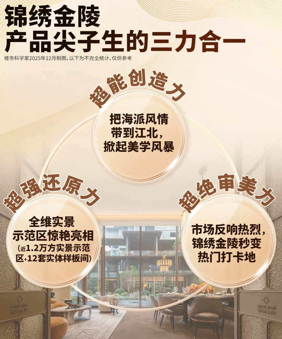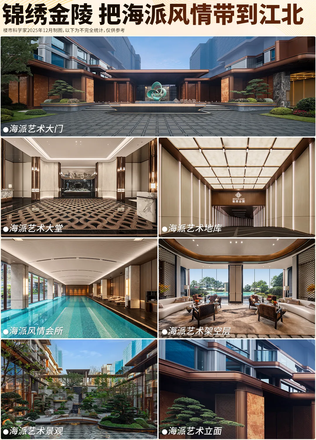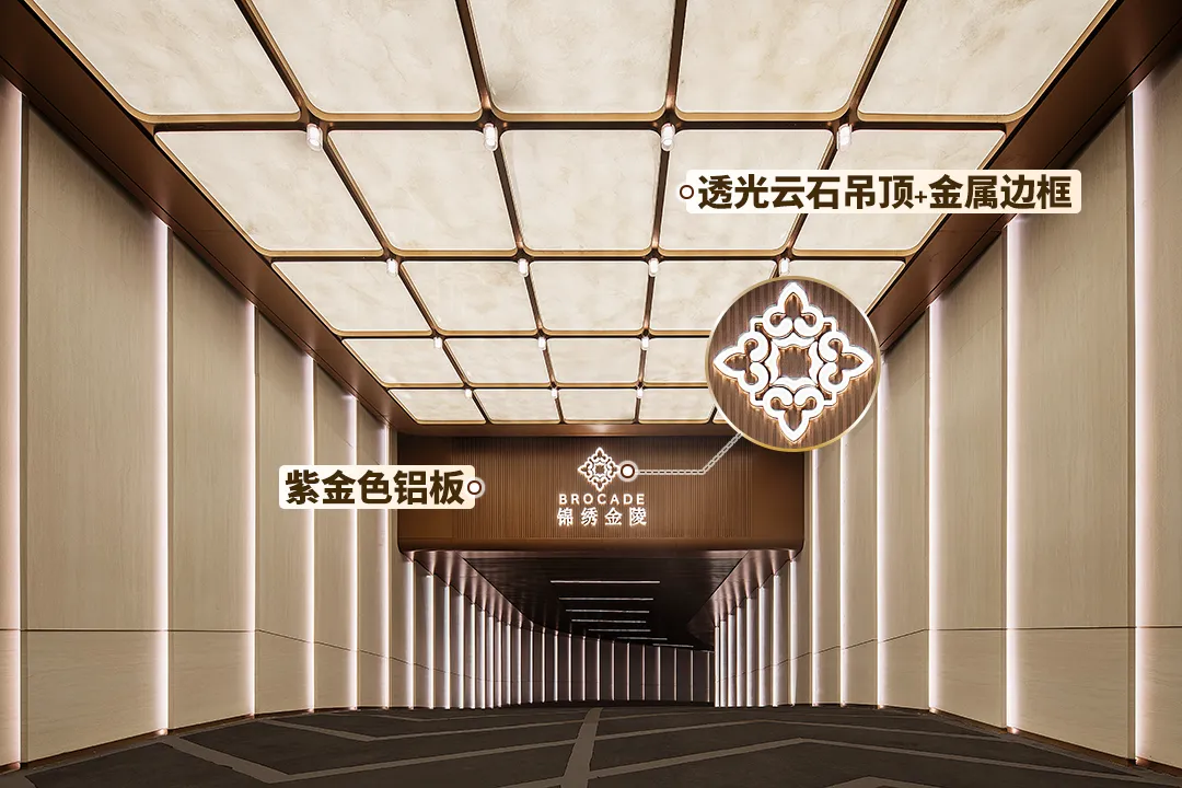 锦绣金陵近1.2万方实景示范区+12套实体样板间已公开,现场秒变热门打卡地。我们以7大核心触点为观察窗,来感受品质颗粒度。跨度近70米的海派艺术大门,尺度惊人,璀璨又厚重的奢华更让你过目难忘。超高的石材含量,是锦绣金陵的标志之一。西班牙珊瑚红+紫金色铝板,搭配名贵松柏,气质不彰自显,要知道珊瑚红石材可是欧洲第三大皇宫马德里皇宫的同款。滨江标志性的艺术雕塑,成为酒店式环岛落客区的点睛之笔。甚至连地面铺装在致敬南京云锦,充满隐奢气质。进入主大堂,瞬间像进入“奢石博物馆”,完全可以和河西6万档豪宅掰腕子了。地面石材拼花,似浪花在脚边拍打,细看才知是五种石材组合而成,而且均打磨成弧形,妙不可言。而艺术屏风和奢石接待台,共同将范围烘托得格外奢雅。尖子生的自我修养,就是要让每条归家动线都足够贵重。锦绣金陵的地库,儒雅有腔调。入库坡道,采用透光云石吊顶与紫金色铝板等的组合,富有韵味。点睛之笔当属锦绣金陵专属ICON,恰到好处地输出自有格调。地库落客区和入口坡道一样运用透光云石吊顶+金属边框等的组合,此处锦绣金陵的专属ICON以门牌形式出现,叠加艺术玻璃门,海派风情一览无遗。锦绣金陵超4000㎡会所级空间(近2000㎡J-club会所+六大主题架空层)的设置,构成了精细化的多模块格局。无论从设计端口到未来使用场景,都能满足全年龄段的社交需求和功能需求。特别值得一提的是,锦绣金陵的会所、架空层、景观、风雨游廊彼此交互,形成了你中有我、我中有你的“视线渗透”,同时做足各场景的设计感和品质感,让超绝海派风情生活方式在江核落地。下沉庭院的立体景观就像画一样,被悬挂在恒温泳池的落地窗外,也在健身房一整排的跑步机前。健身房270°视野,采光和景观都拉满,配置来自美国的高端品牌必确PRECOR品牌健身器材,属于是既要功能又要享受,两手都出彩。私宴厅宛若本就生长在大自然中,宴请完后可以直接步入下沉庭院,游园消食,别有一番情致。女王私人厅,不止拥有落地窗外的下沉庭院美景,锦绣金陵还把它做成了一个更具系统性的空间,女王们可以在这喝茶聊天,聚会赏景。尤其是女王C位演讲台的设计,狠狠拿捏住了氛围感!与景观的交互是锦绣金陵会所的一个很大亮点,另一大亮点则是各场景的品质感和艺术感,适配了不同业主的需求,情绪价值亦得到极大满足。锦绣金陵把“奈尔宝”搬进了社区,孩子看到儿童乐园瞬间尖叫,家长看到瞬间放心。现场玩耍的欢声雀跃,已经说明了一切。再如棋牌室,区别于市面上其他楼盘空间较为局促,锦绣金陵不仅空间更为舒适,而且品位上佳,暖色调营造温馨氛围。仅仅是会所的旋转楼梯,锦绣金陵就让“繁花”从梦想照进现实,处处是气质,出圈又出片。在锦绣金陵,这样的超预期输出还有很多,期待您现场挖掘。六大主题架空层,不只是会所的补充,更是新的全龄社交场域。锦绣金陵架空层按会所标准打造,石材拼花、复古屏风、弧形美学,将场景勾勒得格外雅致。而这些奢华空间,以后都会是园区里的高人气社交空间。以7#架空层来说,落地窗外即是戏水池花园,风景相当出色。锦绣金陵,看到了南京骨子里对山川溪谷的共鸣。所以,他们未按常规做下沉庭院,而是将”山川溪谷”引入景观,让下沉庭院不再下沉,让室内外无界交融,让叠水和大比例镜面水景涤荡进每个人心中,甚至连池底都是精致铺装,很有气场。
