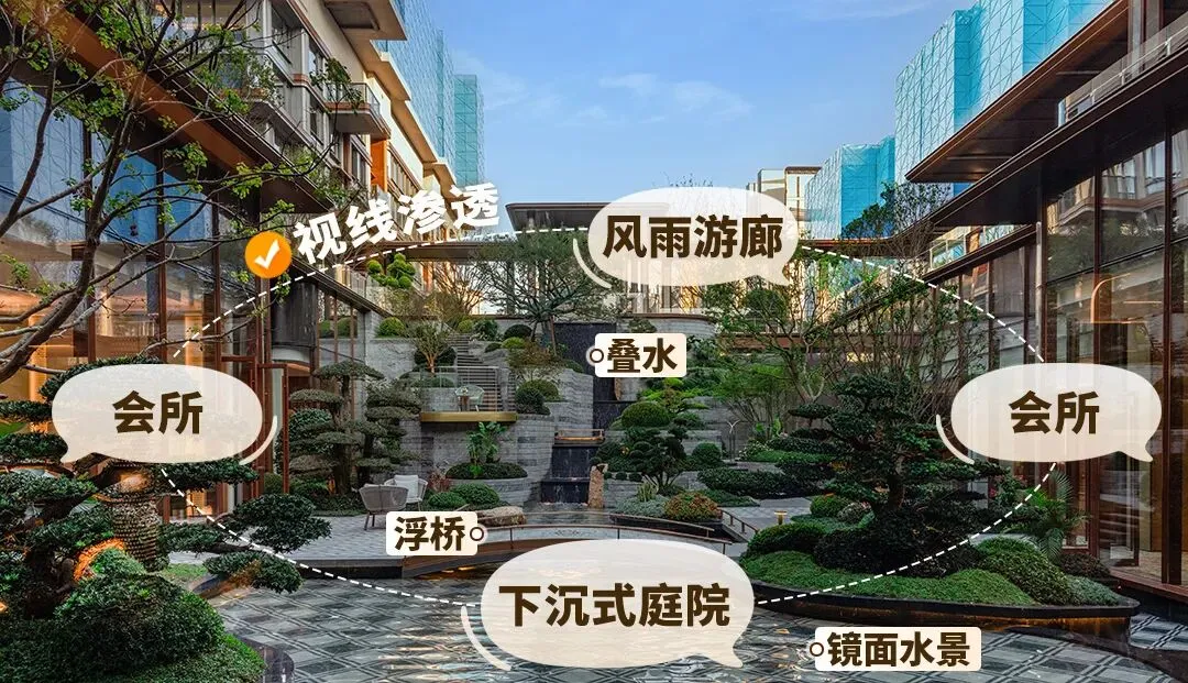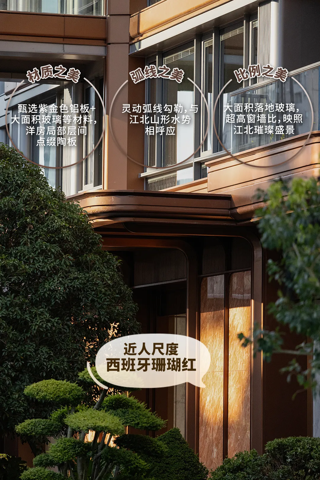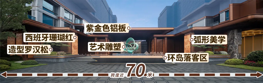 从上往下看,这是一个错落有致的空间,站在下沉庭院里,会感觉自己在山谷间,站在不同高度、不同角度,又是不同景致。下沉庭院和会所彼此视线渗透,在格局打开的同时也成为彼此眼中的风景,锦绣金陵,还是太超前了!甚至,连围绕下沉庭院的风雨游廊等非核心空间,锦绣金陵都重金打造,要的是长期居住满足感。事实上,锦绣金陵拥有的还不止于此,作为江核稀缺的内外双泳池社区,滨江为锦绣金陵带来了标志性的戏水池花园,夏天会成为整个社区小孩的乐园,其他季节会成为重要的景观组成部分。孩子们可以尽情玩耍,家长也更放心。锦绣金陵立面选用紫金色铝板+大面积玻璃等材料,洋房局部层间点缀陶板,让通透度和质感next level,再加上弧线设计,轻松打动颜控。近人尺度西班牙珊瑚红,释放尊贵气息。未来,锦绣金陵毫无疑问将是片区内最具符号化、地标感、昭示性的封面级建筑。