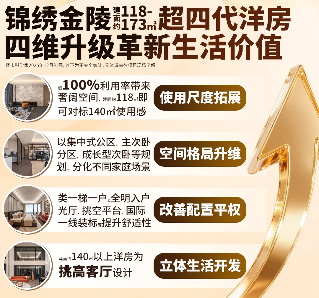 好产品背后是好洞察,当购房者GET到这份情绪的共鸣后,锦绣金陵自然成为长期领先的改善必看。锦绣金陵,产品尖子生名副其实!建面约118-173㎡超四代洋房,锦绣金陵四维升级若要成为产品尖子生,光谈公区还不够,锦绣金陵重视长期居住的舒适感,充分利用容积率约1.6的低密优势,以建面约118-173㎡超四代洋房,带来四大维度升级!直观对比市面上同面积户型的空间尺度,你会发现,超100%利用率带来奢阔空间,锦绣金陵即使是起步建面约118㎡小高层已经可以对标一些140㎡的使用感。▲建面约118㎡展示样板间 仅供参考 具体以实际交付为准项目在空间处理和动线设计上,通过集中式公区、主次卧分区、成长型次卧等规划,分化出不同家庭场景。在保证家庭关系链接外,也尊重各自的作息习惯,有一份互不打扰的自在。