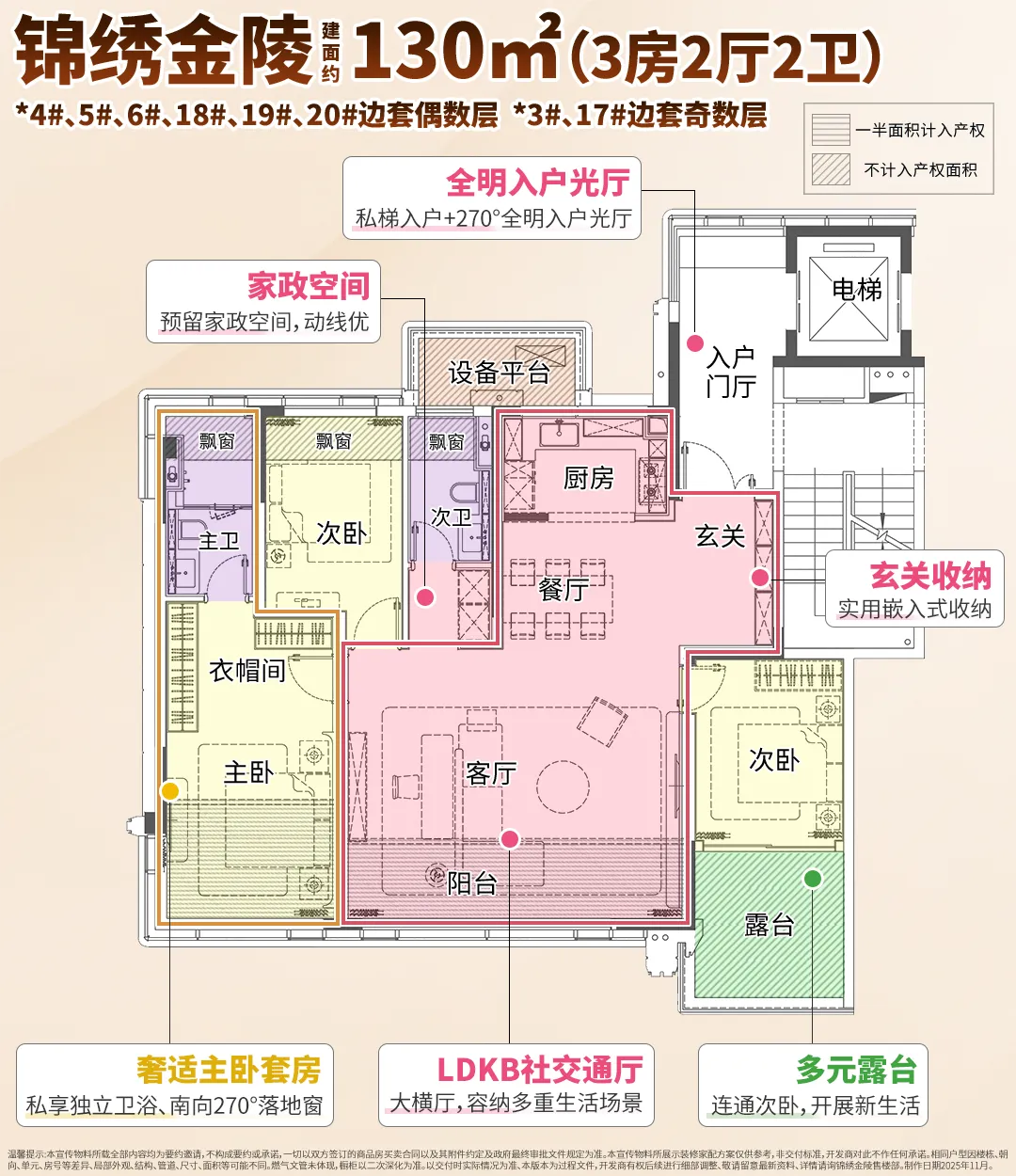 建面约130㎡,宜人的洋房产品。类一梯一户+全明入户光厅,仪式感满满。大尺度横厅,阳台融入后尺度更甚,预留+1房的可能。南次卧舒享大露台,主卧270°落地窗,阳光浪漫满溢。全屋收纳设计科学充足,尊重了生活。次卫旁预留家政空间,动线优。