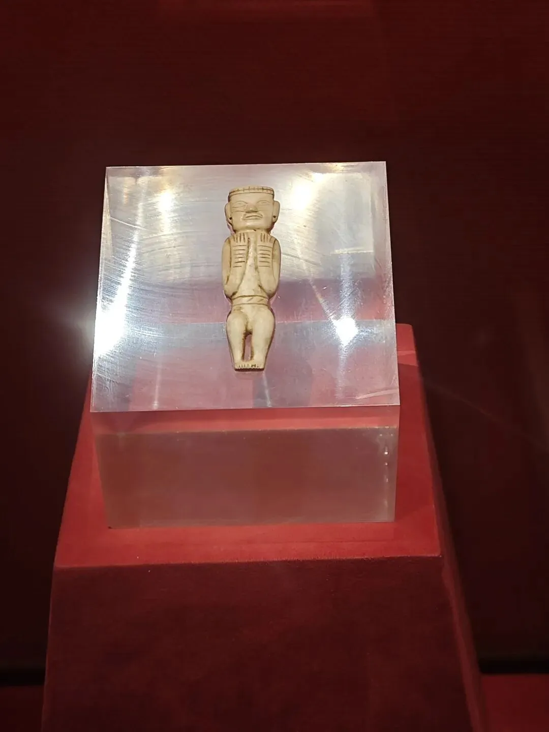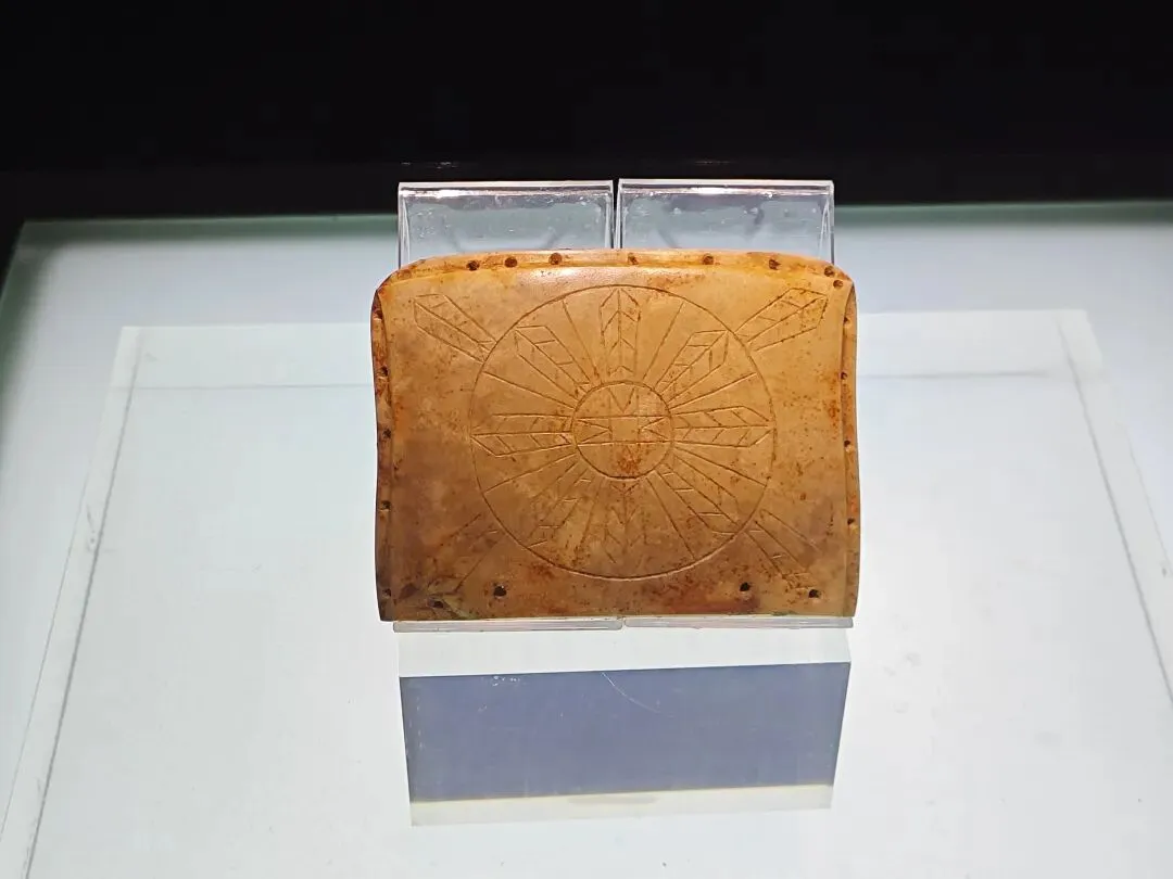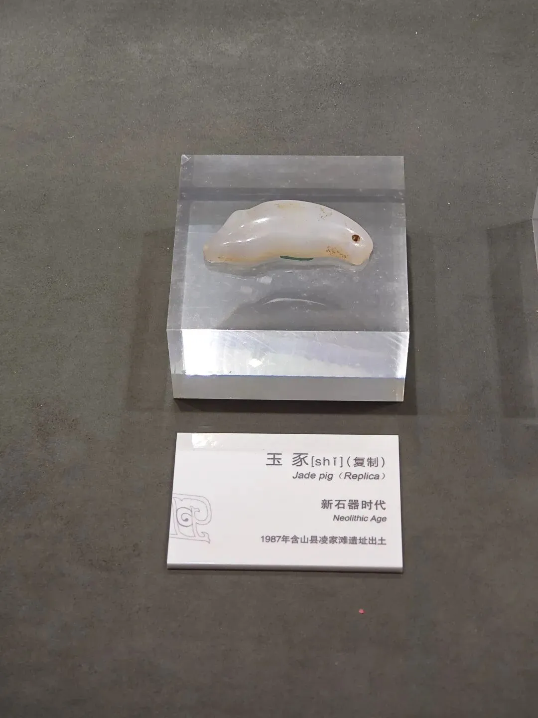 几乎没人,我又看了一些远古时代的文物,左前方电视上播放的动态画面吸引了我,一个玉人然后是玉牌的详细介绍,快步走过去原来是这次想去却无法安排的凌家滩遗址文化主题,出土于马鞍山辖区的含山县,从1987年开始认真细致的考古工作持续了30多年,有重大历史发现可以说把马鞍山地区的远古断代向前推进了一千年,凌家滩文化年代确定为5300多年前,这真是马鞍山博物馆给我的一个厚礼,我想好好观看一遍完整影片,准备向后退几步找到最佳距离,这一退不打紧着实吓得要跳起来,原来脚下是凌家滩遗迹的分布模型缩小版复原,玻璃地面之前我没注意到,突然看见是透明的空洞本能地收住脚步。一个好玩的小插曲!我认真看了全部纪录片,基本了解到这座大型远古遗址群的历史价值和主要藏品,马鞍山博物馆里主要是复制品,于我并无大碍因为都1:1比例严格复制,想想不需要跑几十公里路亲临凌家滩考古遗址公园和博物馆,就可以概览几乎全部精华文物,不亦乐乎不亦快哉。下面是一组凌家滩文物图片↓