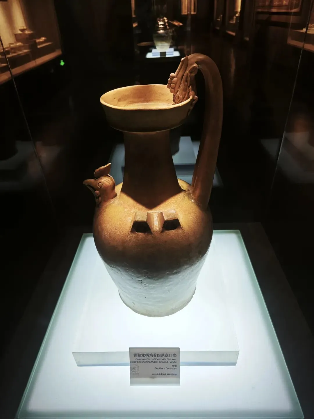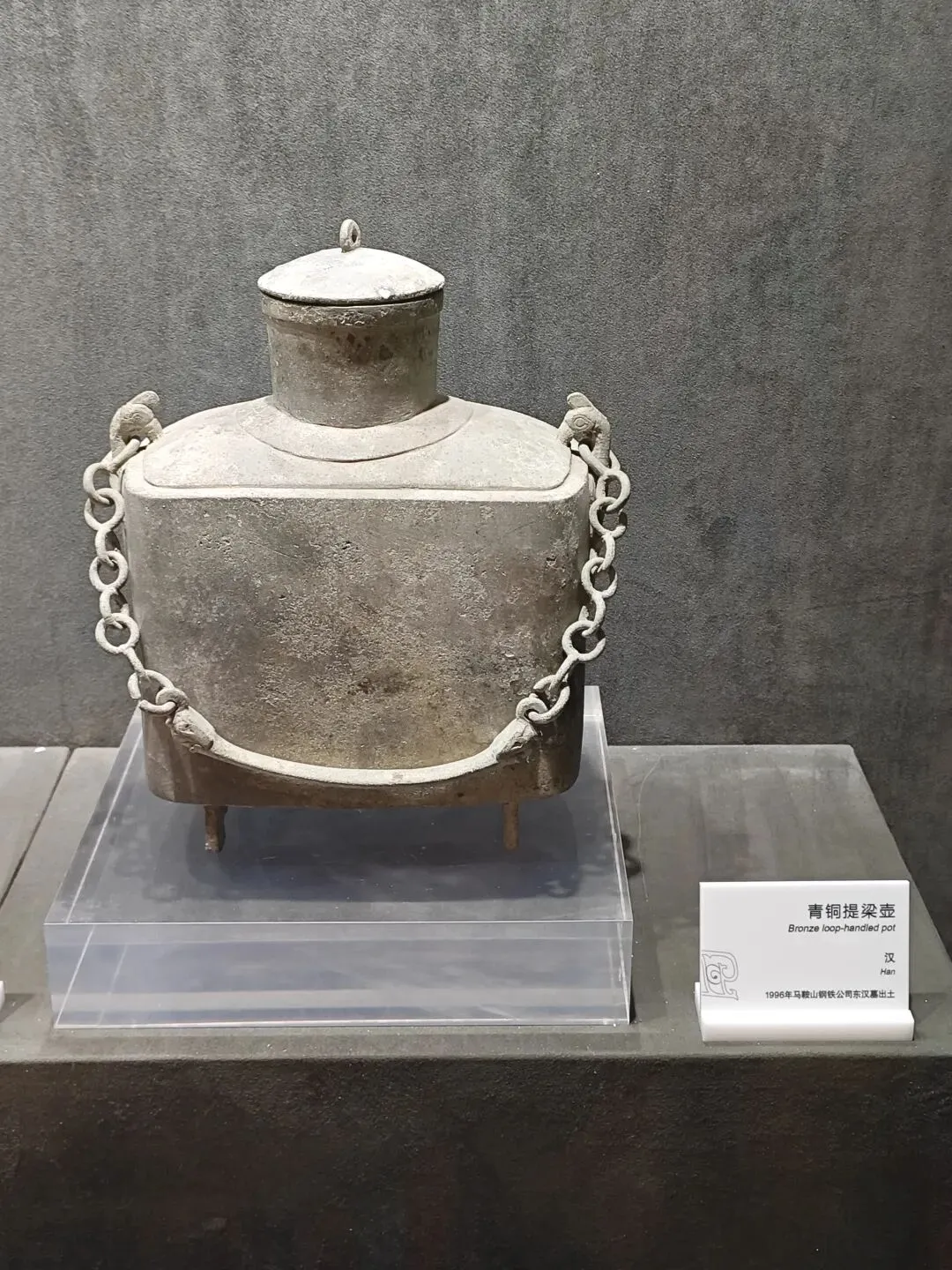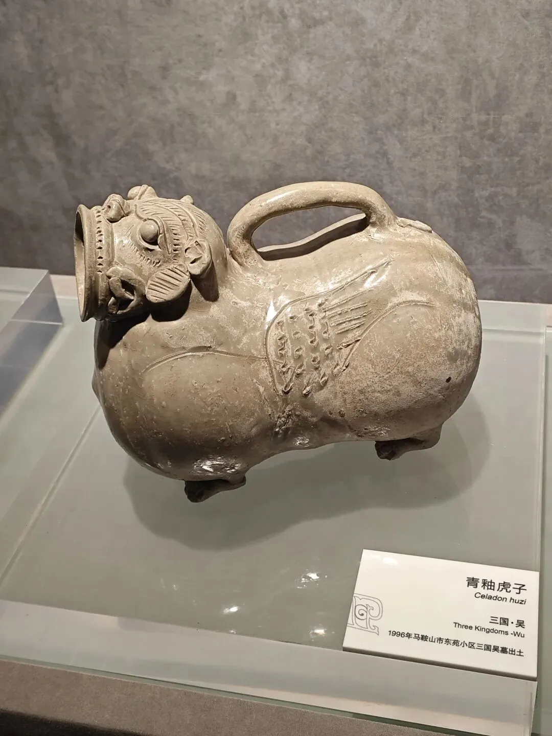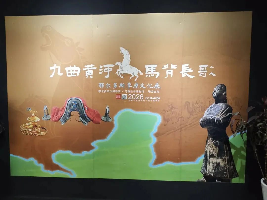(凌家滩共出土6个玉人,跟著名的红山文化和良渚文化相关联)意犹未尽地看完了凌家滩部分展览,心想真是偏得呢,转眼前面几件商周汉代文物又在向我招手了,🈶精美的兽足鼎,🈶细致的勾连云纹铙,🈶别致的⛓链条提梁壶,🈶带“宜候王”铭文的特别铜洗,云纹铙还制作了平面复制品非常养眼。馆内的参观者以个位数计量,幸运的我得以尽情尽兴绕着圈360度全面欣赏观看展品,很久没想到这种VIP级别待遇了。真的太开心啦!前面进到这间题为“碧水东流至此回”的马鞍山历史展厅门时,就远远看到斜对面展厅门内颜色对比鲜艳的布置。转完这个展厅出门直接连到新的展厅,原来这是来自内蒙古鄂尔多斯博物馆的精品特展,从2026.2.10-4.24,老天真是厚待我!还在正月里的最后一天,又送了一份大大的年礼,因为疫情期间的2021年夏天,我和外甥女小妞约在呼和浩特见面,开启内蒙游,走过包头来到鄂尔多斯,只看了壮观的音乐喷泉,住处突然变成密接区待遇危险逼近,博物馆根本没来得及看,只好第一时间快速遗憾离场。没想到啊没想到!五年之后竟然在马鞍山博物馆弥补遗憾,补上了当年不舍放弃的博物馆精品展。真是东方不亮西方亮的惊喜和幸运!看了特展介绍,鄂尔多斯在蒙语中的意思是“众多的宫殿”,位于内蒙古西南部,毗邻陕甘宁三省区,记得2021年我从那里直飞银川很近的。这片神奇的土地是远古文化的发源地之一,号称河套文化时间早在7万年前,后面历经与中原历代政权和各民族的融合,形成了各民族共生的农耕、草原和黄河文化。所以鄂尔多斯博物馆的特展丰富多样很有看头,展览主题为《九曲黄河,马背长歌》。详见下图↓↓一楼参观完毕,接着上到二楼,参观马鞍山博物馆的主打藏品六朝青瓷部分。六朝时期历时近400年,均定都南京,而马鞍山占地利之便,被称作京畿之地,成为拱卫京师的军事重镇;且原来北方的士族大家纷纷南下,带来文化艺术和高雅精致的生活方式,使马鞍山所在之处文风日盛、尽显六朝风流。这个时朝的青瓷全部产于江南地区,窑口多器型丰富,一般熟知的有越窑、瓯窑和洪州窑等。产品用途遍及日用、陈设、文房和明器,而且工艺水平高,设计巧妙,形状各异,非常吸引人,爱喝茶的我还欣赏了好多精美别致的茶具。虽然逛的有点小累,但意犹未尽兴致勃勃,因为收获多多,过了眼瘾美丽了心情,下午雨中游过采石矶后,坐动车奔赴三月春游最后一个目的地南京了。两个城市动车程17分钟,车票15元,我要为心仪太久的南京博物院做好充分准备,提前住到附近也早早预约了参观门票,只等3.19的看馆饕餮大餐啦。