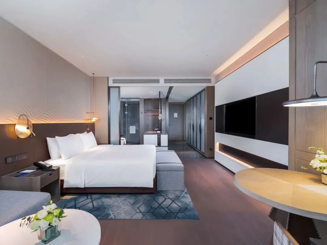 酒店地理位置优越,毗邻多条轨道交通干线,可高效连通核心商圈及主要交通枢纽,300间客房及套房,设计汲取大校场百年航空记忆与金陵在地文化意象,以现代语言重构摩登居住空间,部分客房可远眺响水河与城市文化地标,亦可尽览新城天际线,在城市繁华之中构筑一方静谧空间。