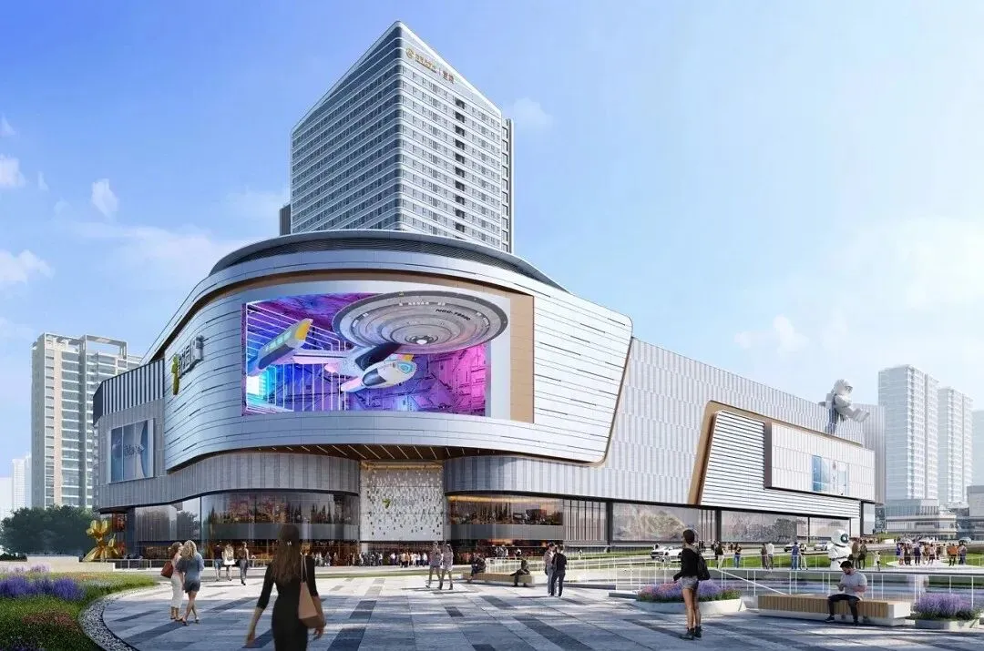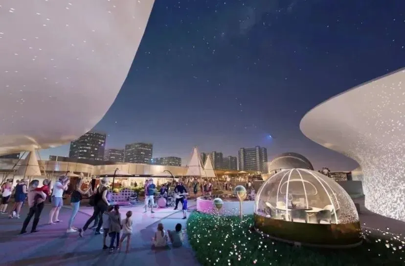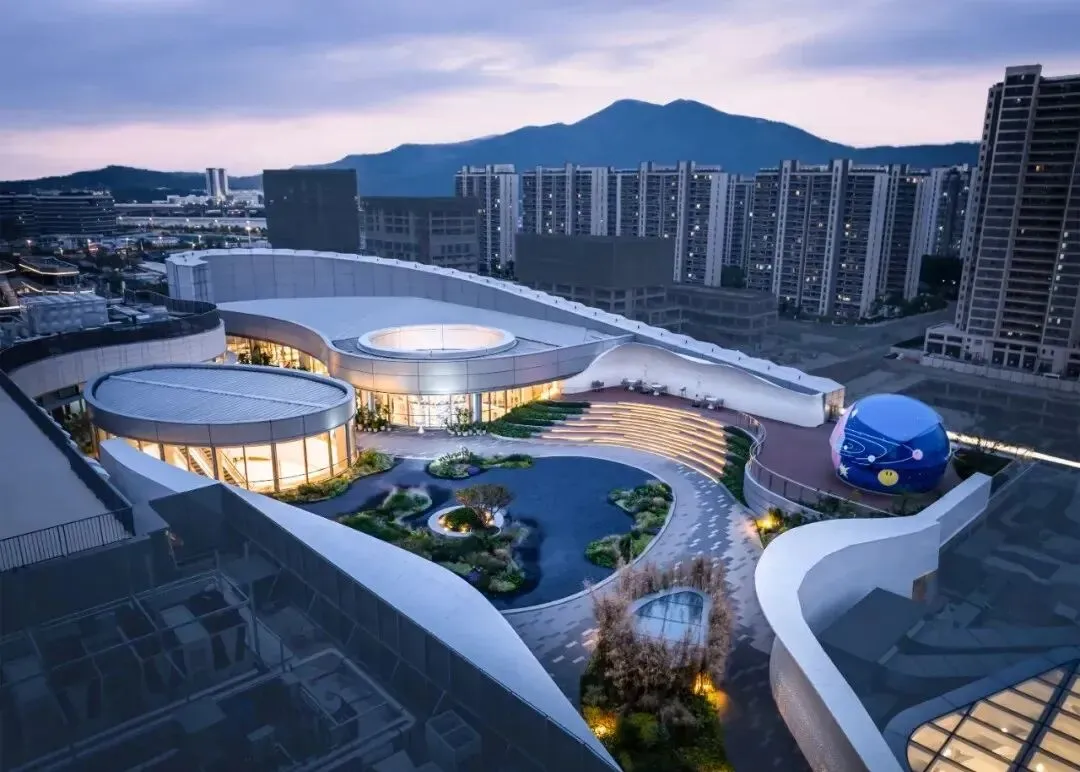 项目由伍兹贝格全球高级董事合伙人黄馨谚、合伙人叶浩辉领衔设计,围绕“天文+生态”核心主题,打造从地下到屋顶的沉浸式“宇宙与自然”探索之旅。外立面长达700米,以星系流光为意象,光影随时间变化,形成“会呼吸的城市皮肤”。