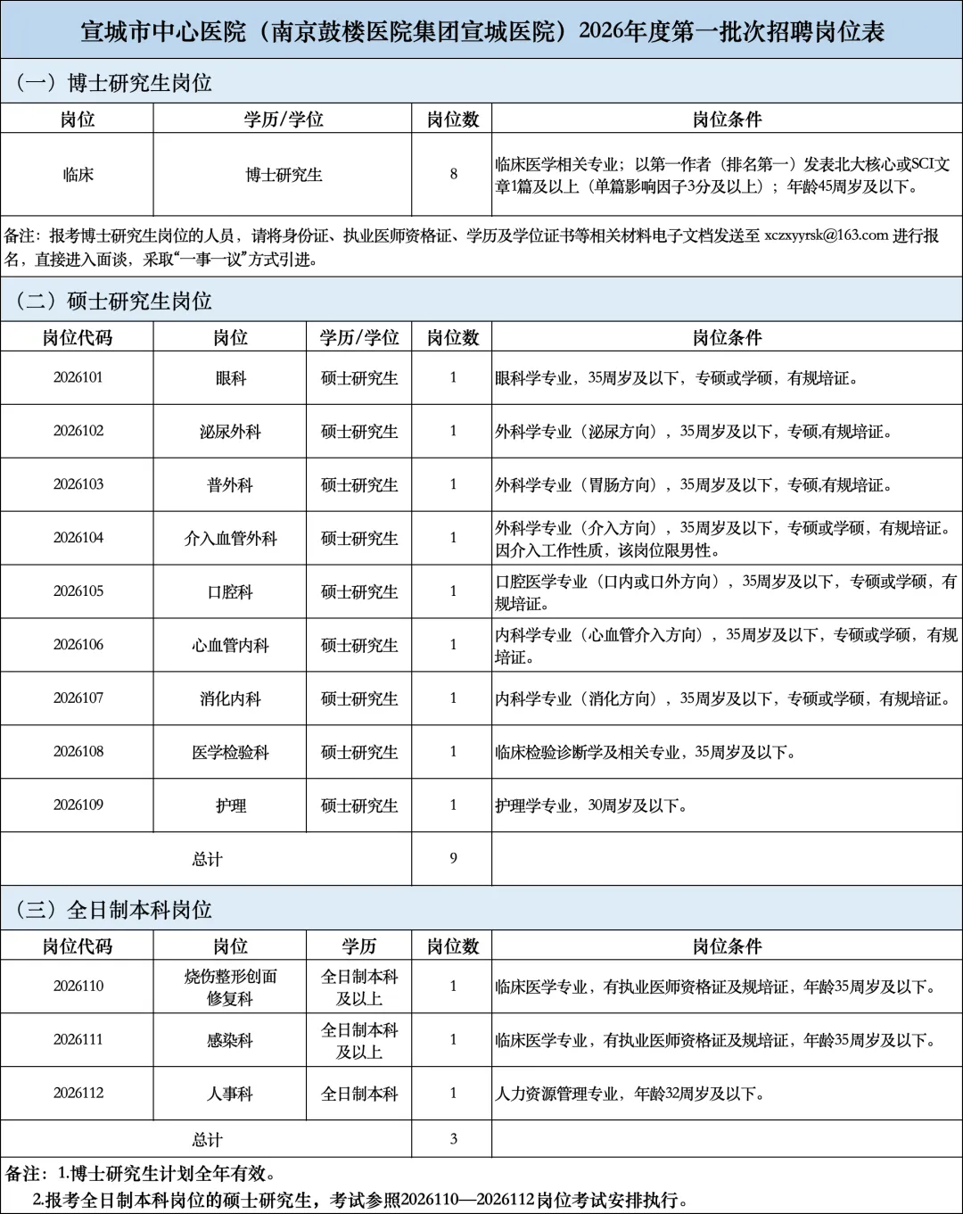 2026年度第一批次招聘具体岗位信息详见:《宣城市中心医院(南京鼓楼医院集团宣城医院)2026年度第一批次招聘岗位表》