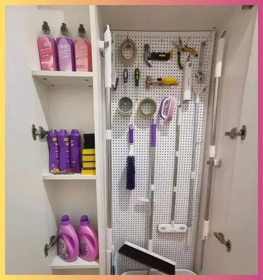 内部怎么分配的呢?上面是开放式的隔板,放那些经常用的东西——扫帚、拖把、吸尘器;中间用抽屉,装清洁剂、垃圾袋这些消耗品;下面留了个通风的空间,小的垃圾桶就可以放进去。最妙的是,她还在柜子内侧贴了防水板,再装了个小挂杆,湿拖把直接挂上去就能干,再也不用担心滴水的问题。